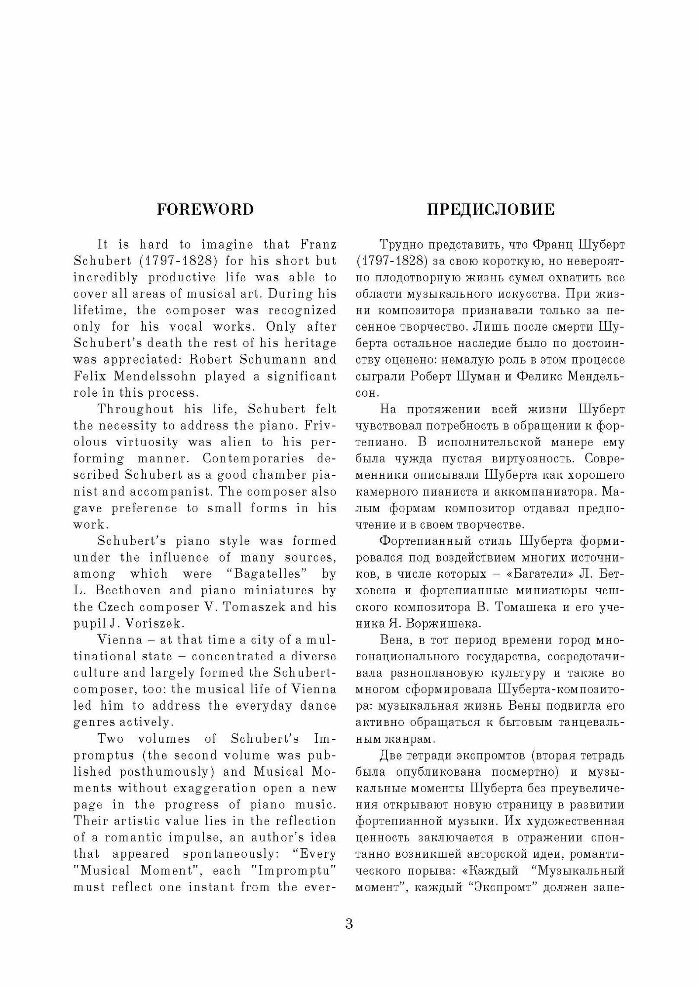 Фортепианное наследие Ф. Шуберта (1797-1828) невероятно разнообразно в жанровом отношении. На протяжении всей жизни композитор обращался к танцевальным жанрам (особенно вальсам).Особое место в сердцах пианистов различной профессиональной подготовки занимают его Экспромты и Музыкальные моменты. Каждая пьеса индивидуальна по своим выразительным характеристикам и образному строю.Сборник адресован широкому кругу пианистов, начиная со средних классов детских музыкальных школ, а также любителям фортепианной музыки.