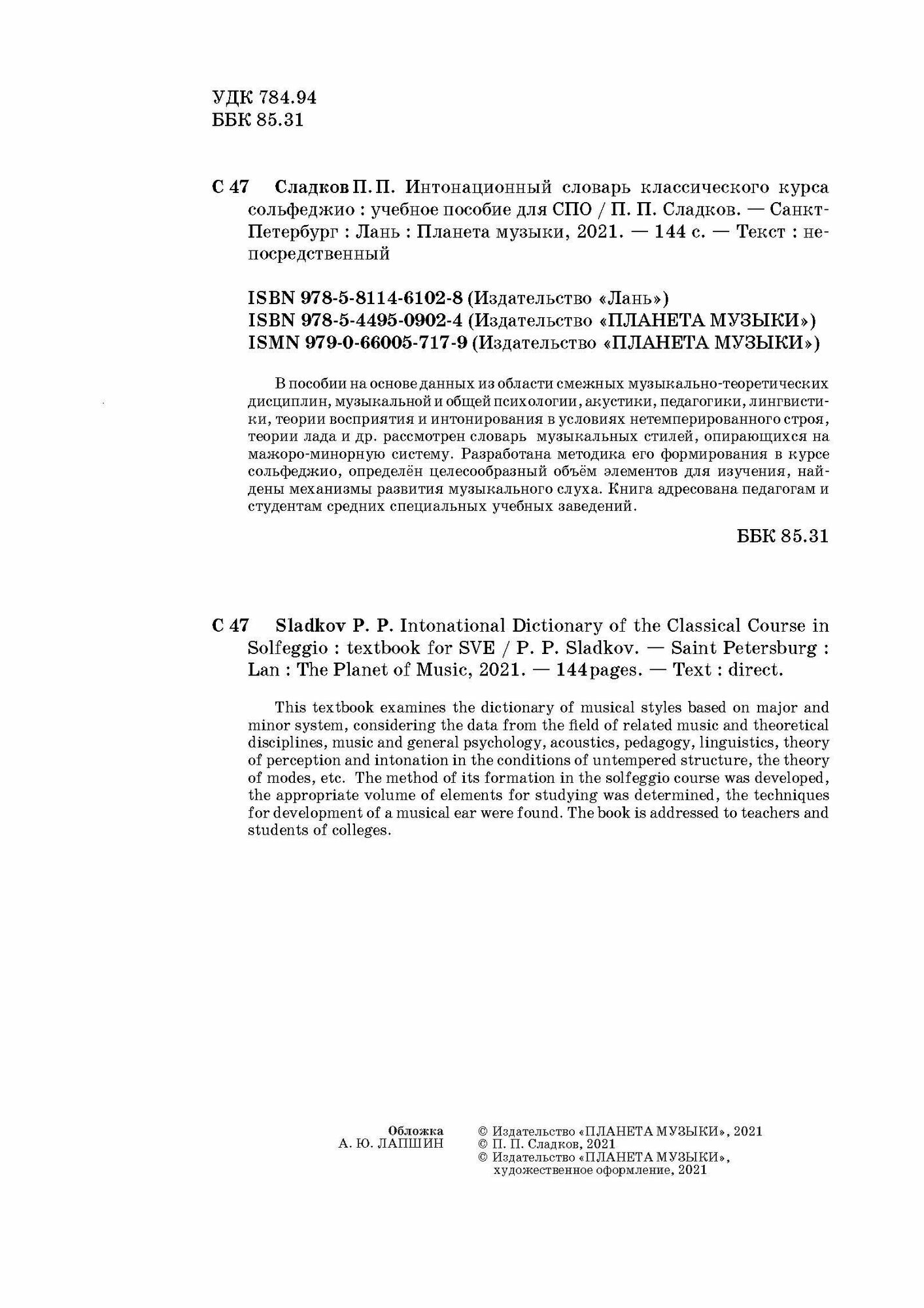 Интонационный словарь классического курса сольфеджио (П. П. Сладков); Издательство «Планета музыки», 2022