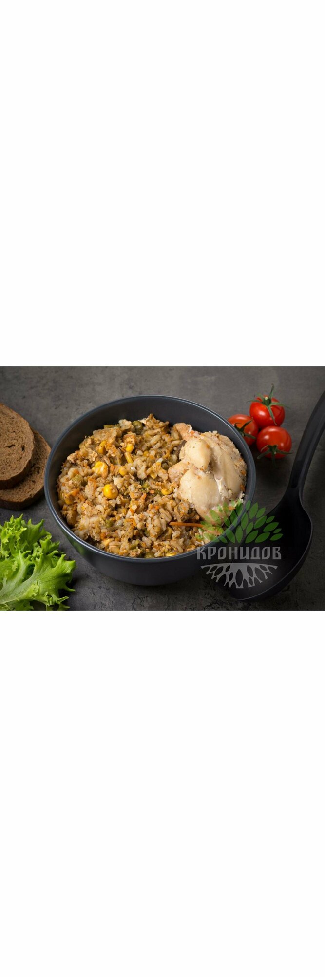 Благодаря компактной, надежной и легкой упаковке, готовые блюда от Кронидов очень удобны для походов и путешествий. Нежное мясо цыпленка и ароматный рис с овощами – все, что нужно для сбалансированного питания активных людей. Обладает оптимальной пищевой и энергетической ценностью, обеспечит нужный заряд энергии и внесет разнообразие в ваш походный рацион.Особенности:В состав входят: мясо цыпленка (филе), горошек зеленый, кукуруза сладкая, перец сладкий, лук репчатый сушёный, морковь свежая, крупа рисовая, чеснок, соль поваренная пищевая, перец черный молотый.Пищевая и энергетическая ценность 100 гр продукта: белки - не менее 6 г; жиры - не более 7 г; углеводы - не более 11 г; калорийность - 131,0 ккал/ 549 кДж.Хранить при температуре от 0° до +25°C и относительной влажности воздуха не более 75% - 24 месяца со дня изготовления.Вскрытую упаковку хранить не более двух суток при температуре от 2° до 4°C.Срок годности: 24 месяца. Внимание! Не помещать пакет в микроволновую печь.