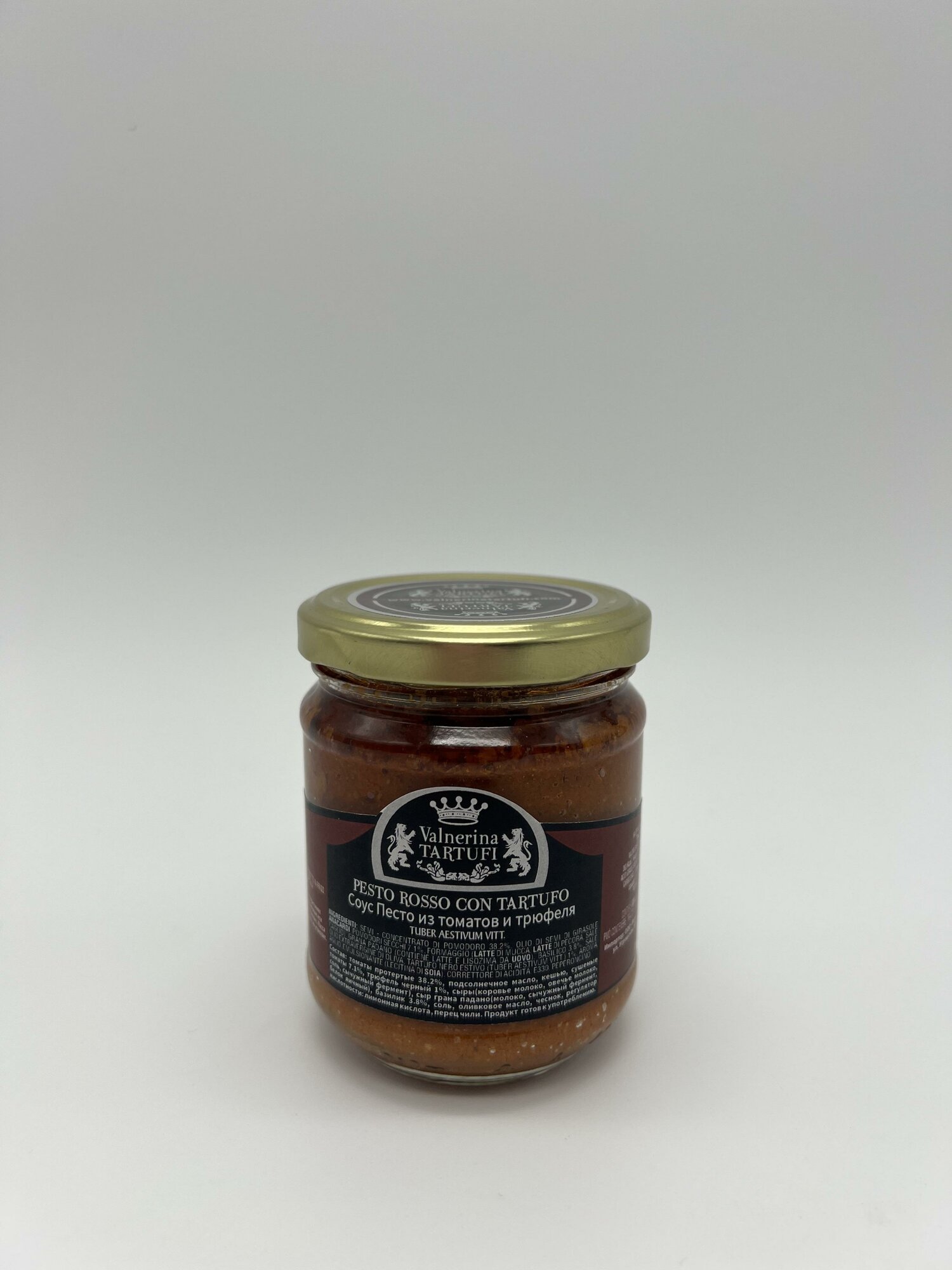 | Состав | Томаты протертые 38,2%, подсолнечное масло, кешью, сушеные томаты 7,1%, трюфель черный 1%, сыры, сыр грана падано, базилик 3,8%, соль, оливкое масло, чеснок, регулятор кислотности |