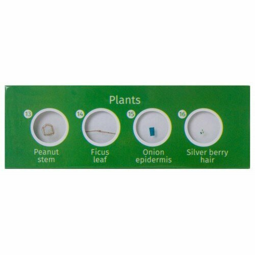 Всего в наборе 24 образца. Все микропрепараты подписаны и сгруппированы по темам: например, есть пластины «Животные», «Растения» и «Крошечные существа». Образцы оклеены цветной бумагой с круглыми прозрачными окошками.