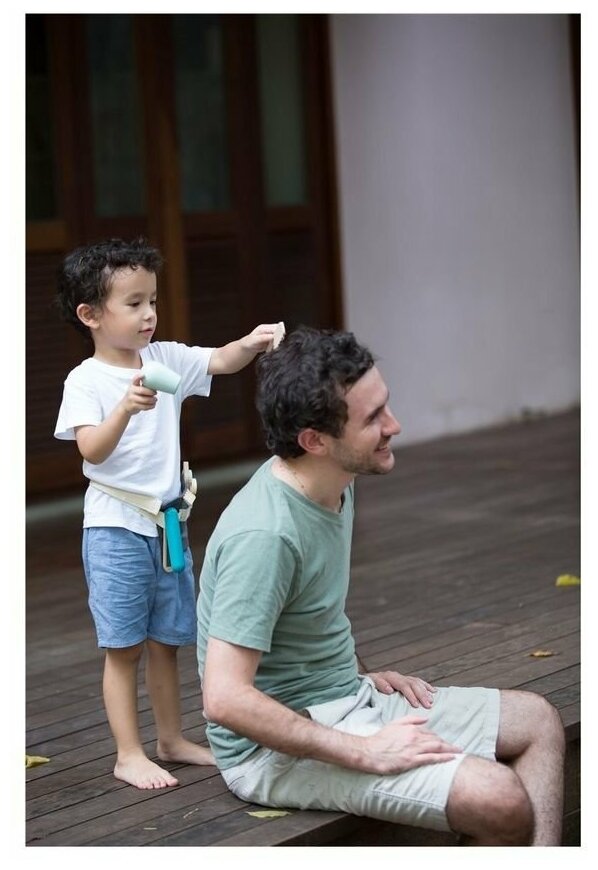 Юные парикмахеры придут в восторг от набора Plan Toys, который состоит из множества инструментов: деревянные игрушечные ножницы, расческа, выпрямители, фен, машинка для стрижки волос и поясная сумка для хранения.