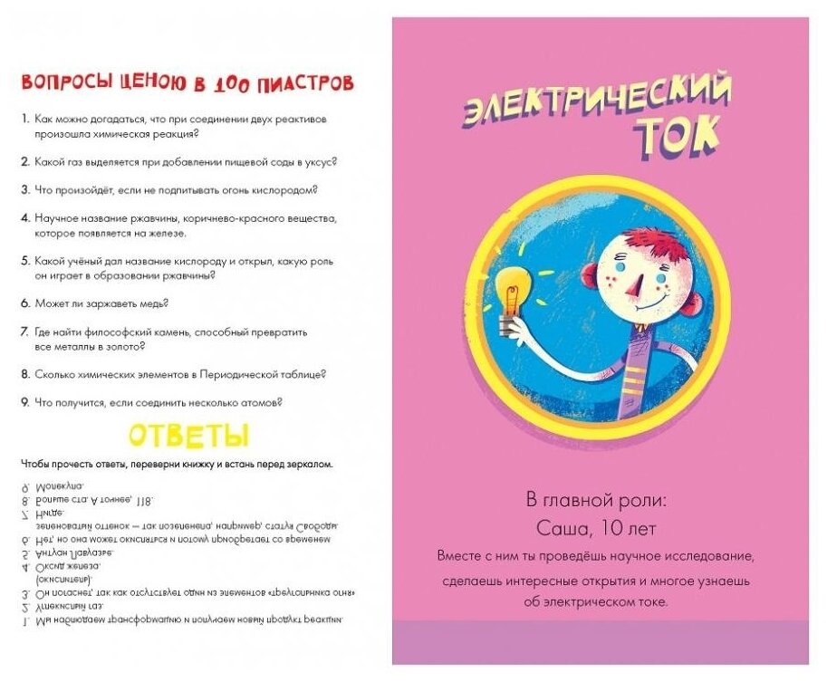 Основные три раздела: «Химические соединения», «Электрический ток», «Простейшие механизмы» раскрывают главные направления для экспериментов и поиска более подробной информации, а необычные иллюстрации помогают младшим школьникам начать работать с книгой практически самостоятельно, хотя и не без помощи и контроля взрослых.