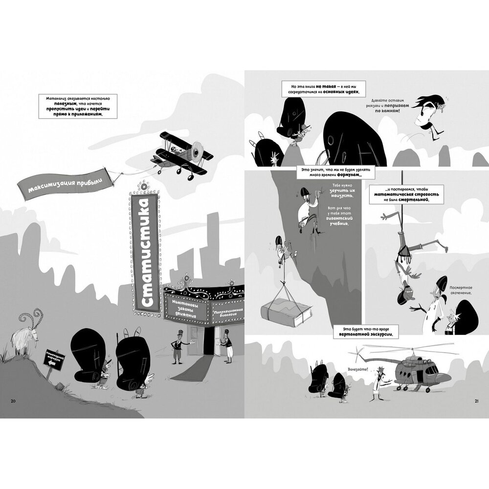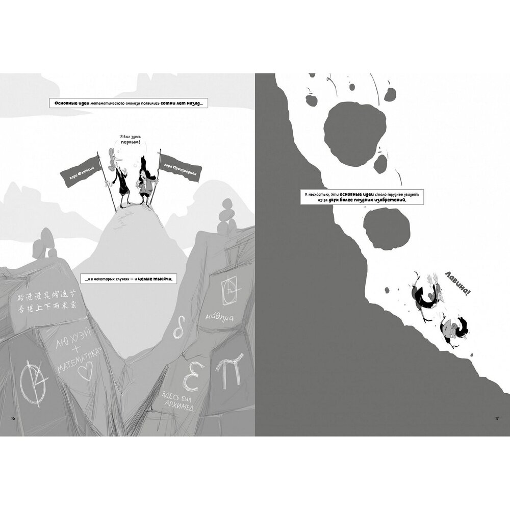 Известный художник-комиксист Грейди Клейн и единственный в мире экономист-юморист Йорам Бауман станут нашими проводниками в восхождении на пики горы Производная и горы Интеграл. С этих вершин мы увидим, как матанализ связан с другими областями математики. Начав с задач на измерение скорости и определение площади, авторы показывают, как основная теорема матанализа связывает воедино эту дисциплину. Мы встретимся с гениями — Архимедом, Лю Хуэем и Бонавентурой Кавальери, — которые выжили на этих горных склонах благодаря своей смекалке и подготовили нас к встрече с опасными лавинами, вызванными математической строгостью. Продолжим свой путь, проберемся сквозь пределы и экстремумы, оптимизацию и интегрирование, и узнаем, как применять матанализ в экономике, физике и во многих других областях. Обнаружим, что матанализ вовсе не высочайшее достижение математики, но его инструменты лежат в основе всего того, что было достигнуто в дальнейшем. Увлекательный научно-популярный комикс снабжен Глоссарием, позволяющим легко ориентироваться в основных терминах.