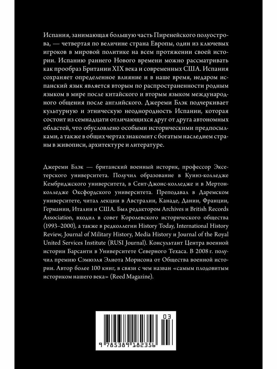 Краткая история Испании от ранних поселений, владычества Рима и арабского завоевания Пиренейского полуострова до возрождения Испании в XVII веке, войны на полуострове и революции в Испанской Америке, катастрофической Гражданской войны и тоталитарного режима Франко, Второй мировой войны и далее, до наших дней. Освещая главные вехи, включая христианскую Реконкисту, плавания Колумба, колонизацию Кубы, Филиппин и Пуэрто-Рико, правление Габсбургов и проведенную Бурбонами централизацию, затрагивая темы влияния Великой французской революции и Наполеоновских войн, падения монархии в 1930-х годах и многие другие, Джереми Блэк уделяет пристальное внимание самобытности регионов Испании, дает прогнозы на будущее, а также характеризует векторы культурного развития и общемирового влияния Испании в литературе, изобразительном искусстве, музыке и других сферах.