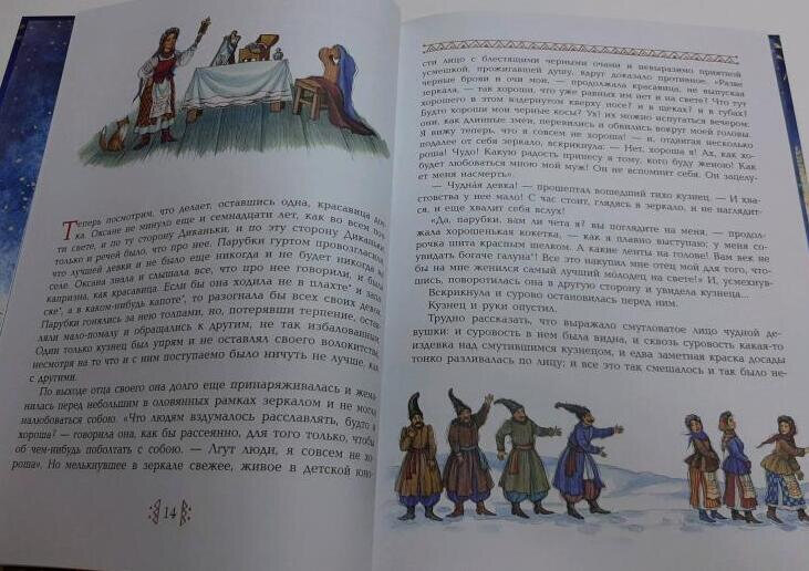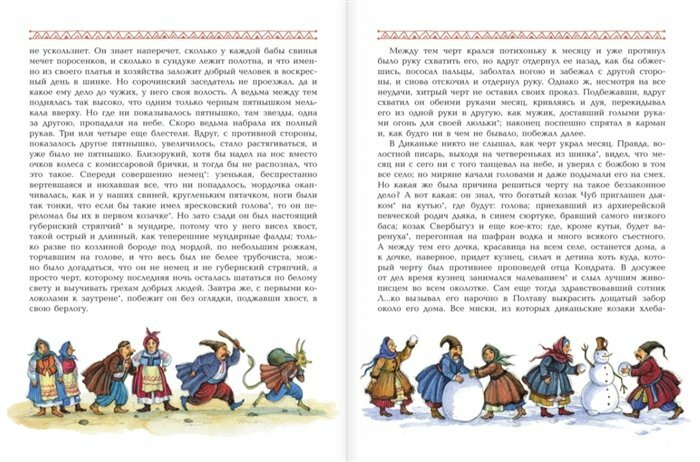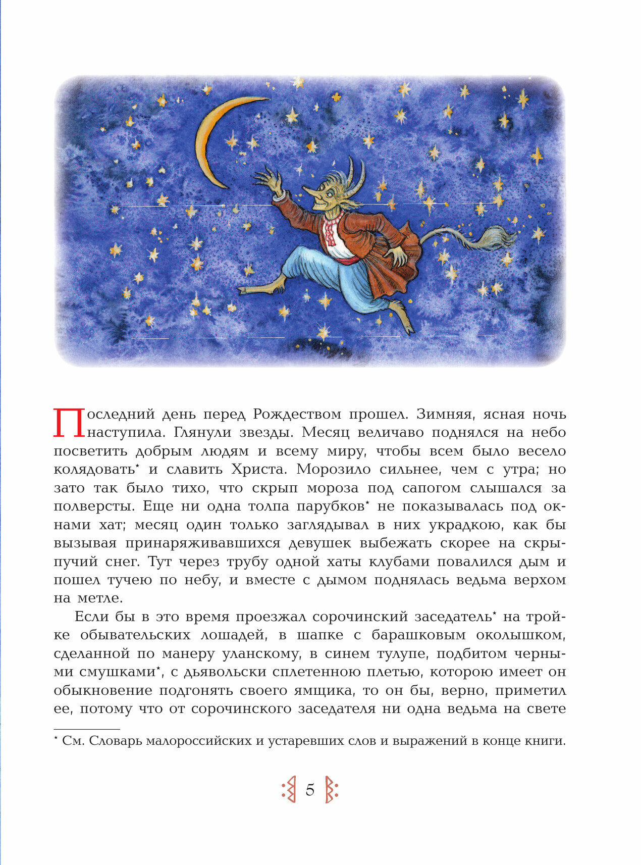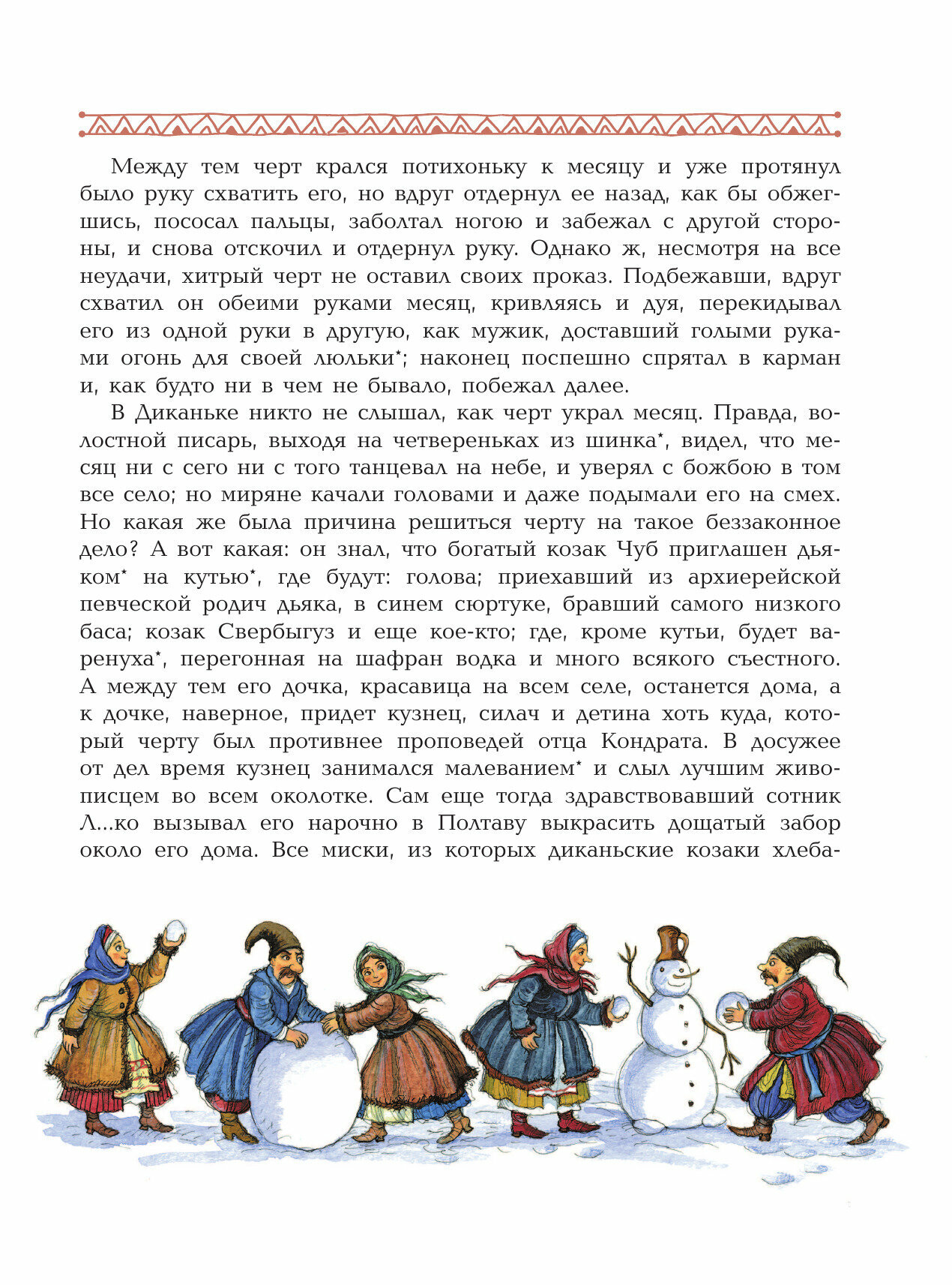 Классическая история, одна из самых веселых повестей Н.В. Гоголя, все в ней проникнуто праздничным настроением, рождественской атмосферой и колоритом. Издание великолепное, иллюстрации прекрасной Ирины Петелиной - красивые и самобытные с юмором и настроением. Их много. Шрифт крупный, офсетная печать. В конце книги представлен словарь устаревших слов.