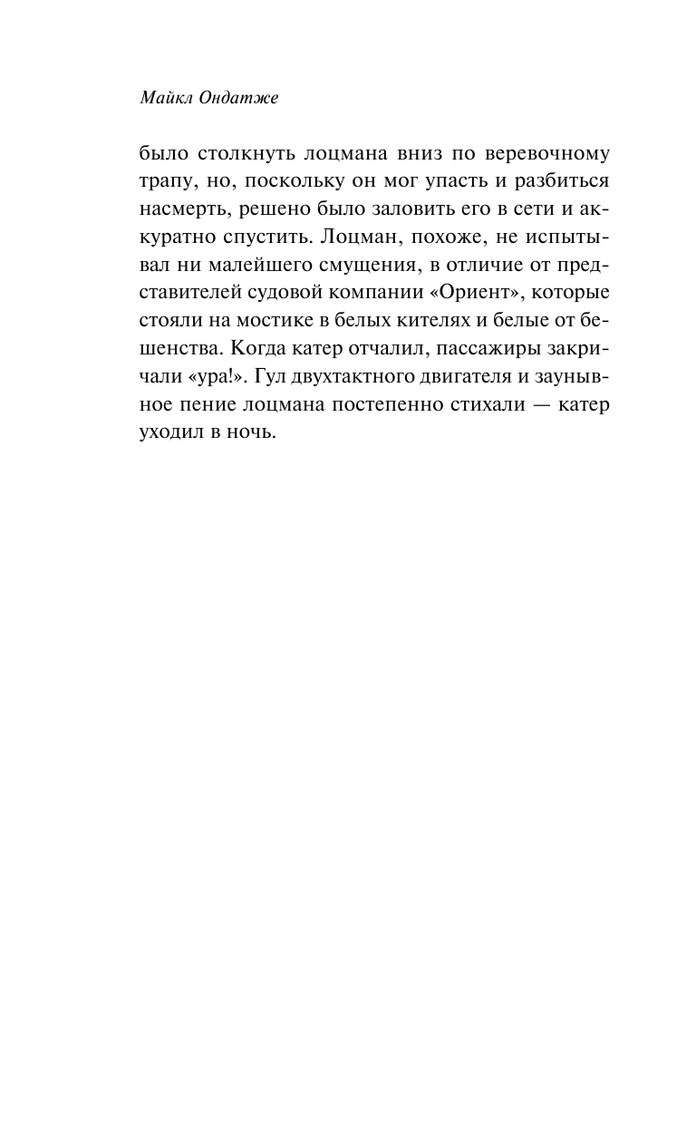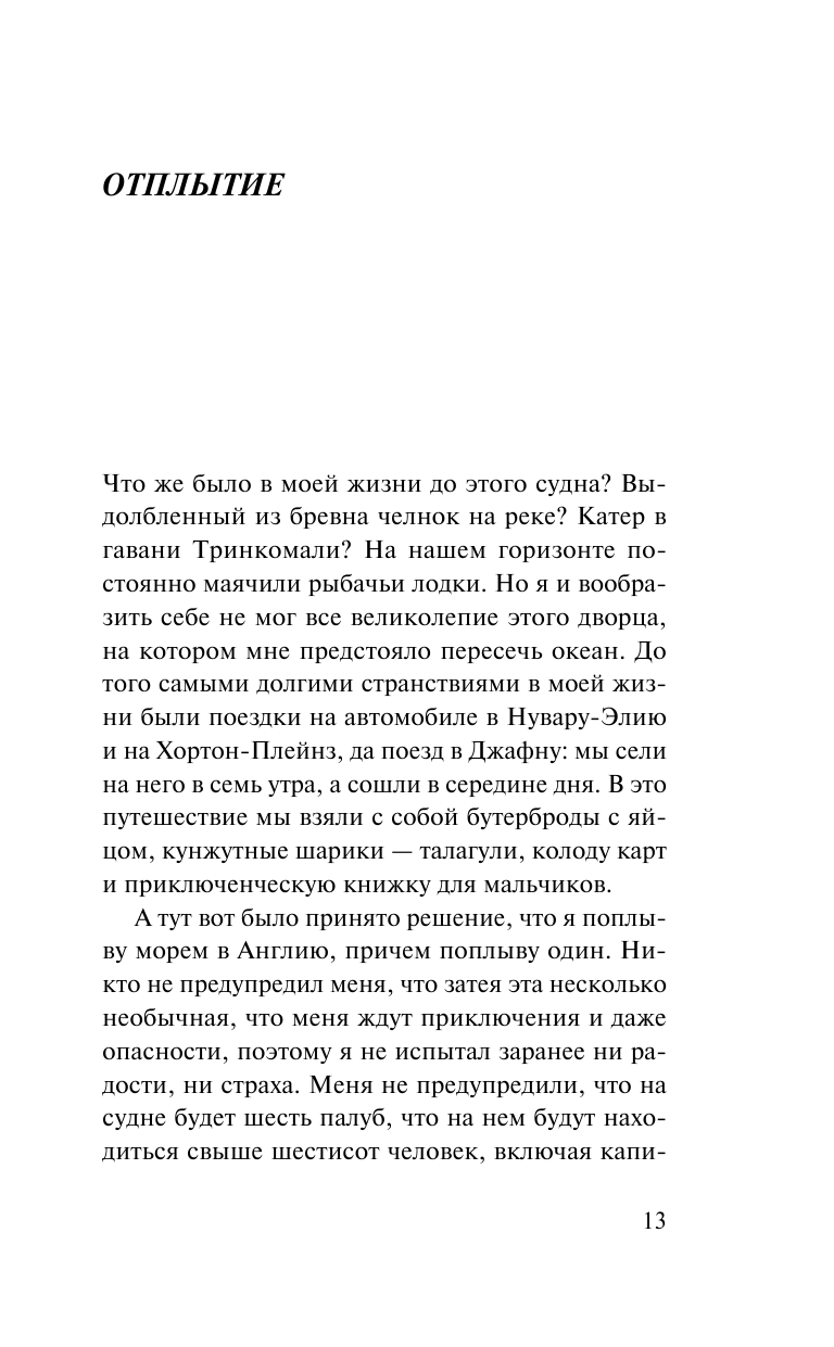 Необычный роман - взросление , про трёхнедельное путешествие на корабле 11-летнего мальчика из Шри-Ланки в Великобританию. Спустя тридцать лет мальчик вырос и рассказывает читателю эту историю , он интерпретирует свой , возможно , самый важный в жизни опыт. Казалось бы , ничего особенного с мальчиком за эти три недели путешествия не произошло , но именно оно определило его жизнь на долгие годы вперёд. Обстоятельный , невероятно интересный рассказ о приключениях и людях , которые сумели передать мальчику что-то по настоящему важное.