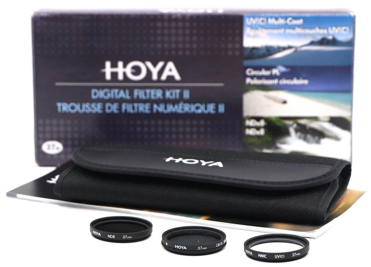 Набор из трех светофильтров HOYA Digital Filter Kit на все случаи жизни. Включает самые необходимые для фотографа фильтры: защитный ультрафиолетовый UV(C) HMC MULTI, поляризационный PL-CIR и нейтрально-серый NDx8.