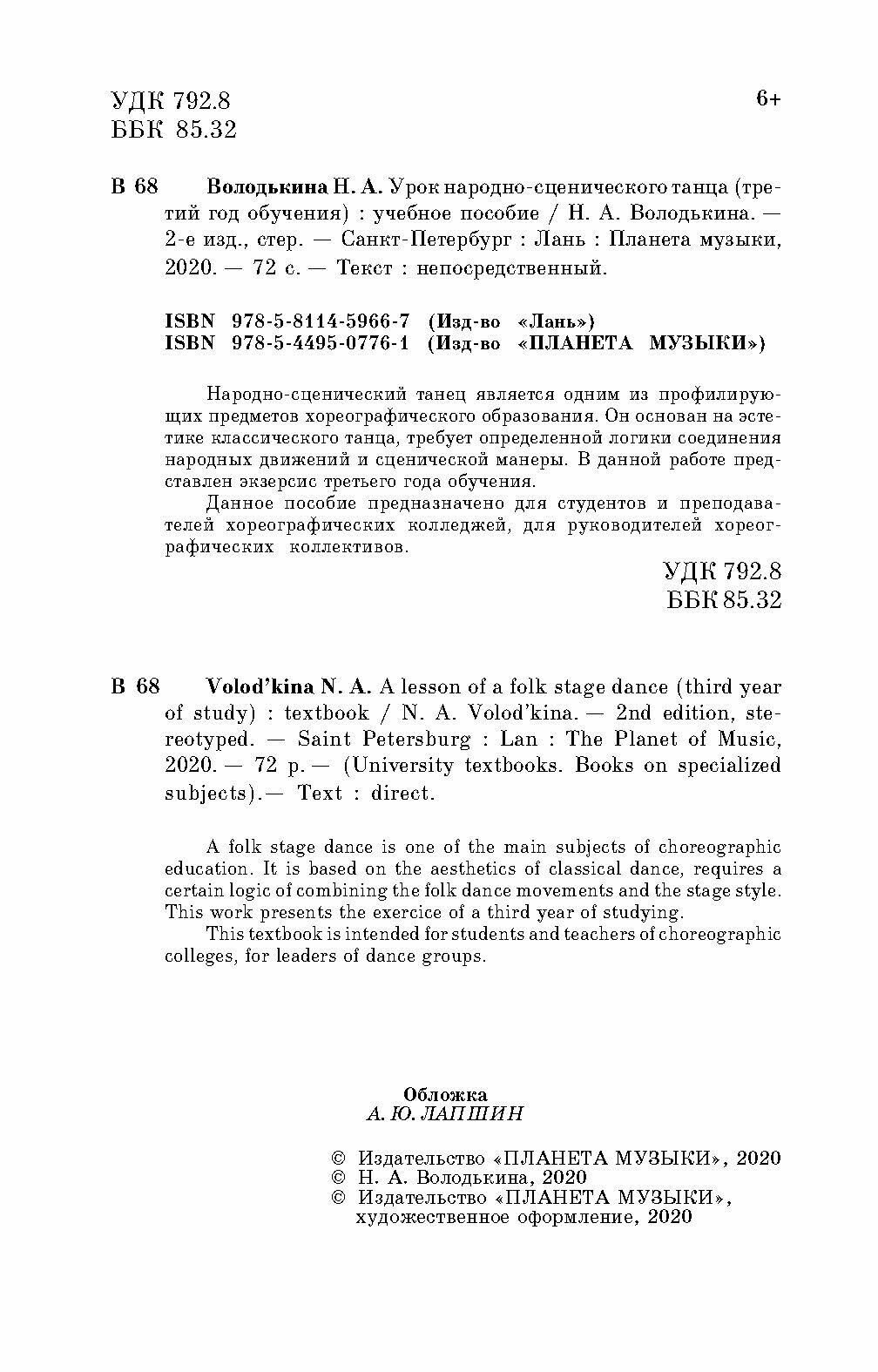 Урок народно-сценического танца (третий год обучения) (Н. А. Володькина); Издательство «Планета музыки», 2020