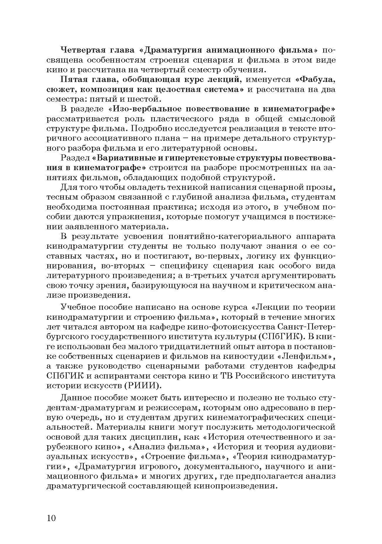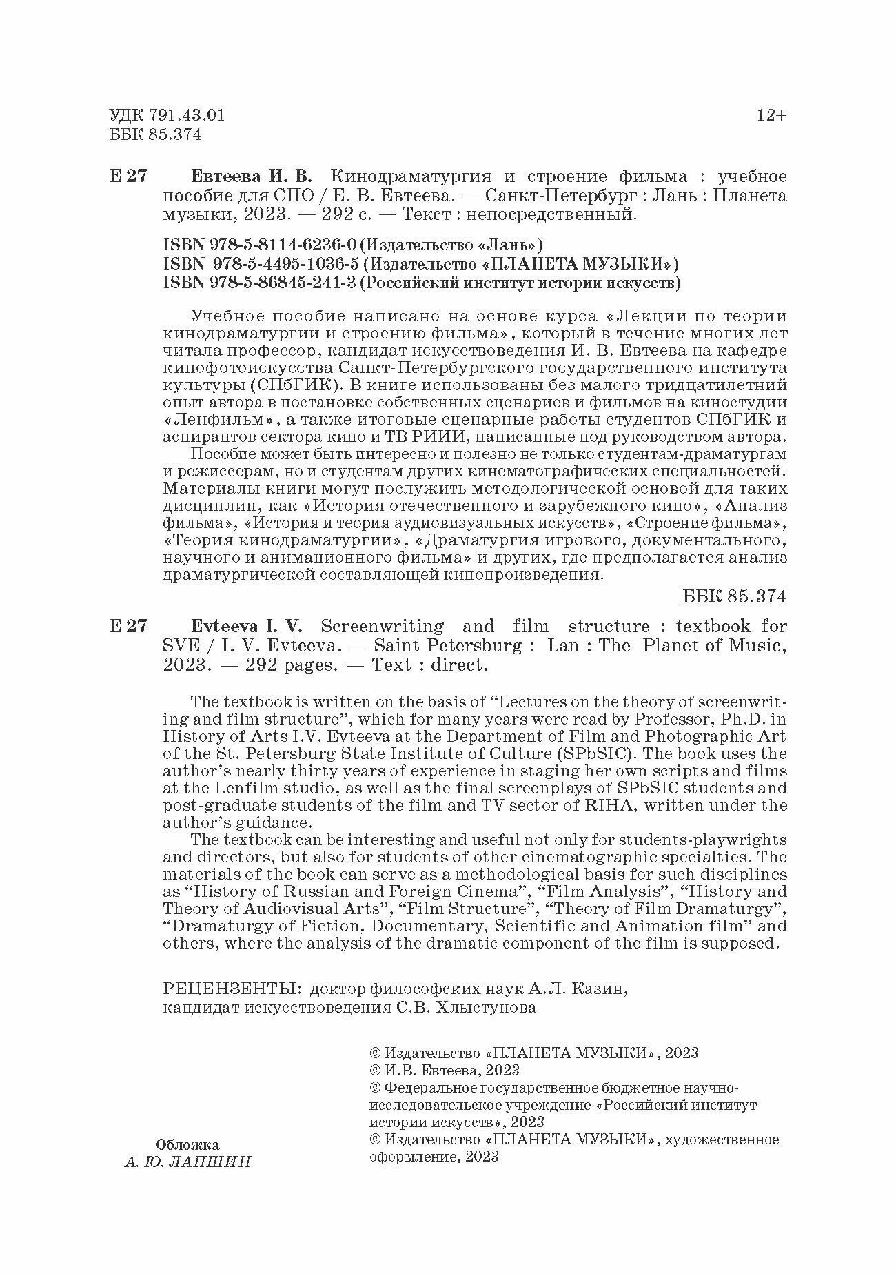 Учебное пособие написано на основе курса «Лекции по теории кинодраматургии и строению фильма», который в течение многих лет читала профессор, кандидат искусствоведения И. В. Евтеева. В книге использованы без малого тридцатилетний опыт автора в постановке собственных сценариев и фильмов на киностудии «Ленфильм», а также итоговые сценарные работы студентов. Данное пособие может быть интересно и полезно не только студентам-драматургам и режиссерам, которым оно адресовано в первую очередь, но и студентам других кинематографических специальностей. Материалы книги могут послужить методологической основой для таких дисциплин, как «История отечественного и зарубежного кино», «Анализ фильма», «История и теория аудиовизуальных искусств», «Строение фильма», «Теория кинодраматургии», «Драматургия игрового, документального, научного и анимационного фильма» и многих других, где предполагается анализ драматургической составляющей кинопроизведения. The textbook is written on the basis of «Lectures on the theory of screenwriting and film structure», which for many years were read by Professor, Ph.D. in History of Arts I.V. Evteeva at the Department of Film and Photographic Art of the St. Petersburg State Institute of Culture (SPbSIC). The book uses the author’s nearly thirty years of experience in staging her own scripts and films at the Lenfilm studio, as well as the final screenplays of SPbSIC students and post-graduate students of the film and TV sector of RIHA, written under the author’s guidance. This textbook can be interesting and useful not only for students-playwrights and directors, to whom it is addressed in the first place, but also for students of other cinematographic specialties. The materials of the book can serve as a methodological basis for such disciplines as «History of Russian and Foreign Cinema», «Film Analysis», «History and Theory of Audiovisual Arts», «Film Structure», «Theory of Film Dramaturgy», "Dramaturgy of Fiction, Documentary, Scientific and Animation film” and many others, where the analysis of the dramatic component of the film is supposed.