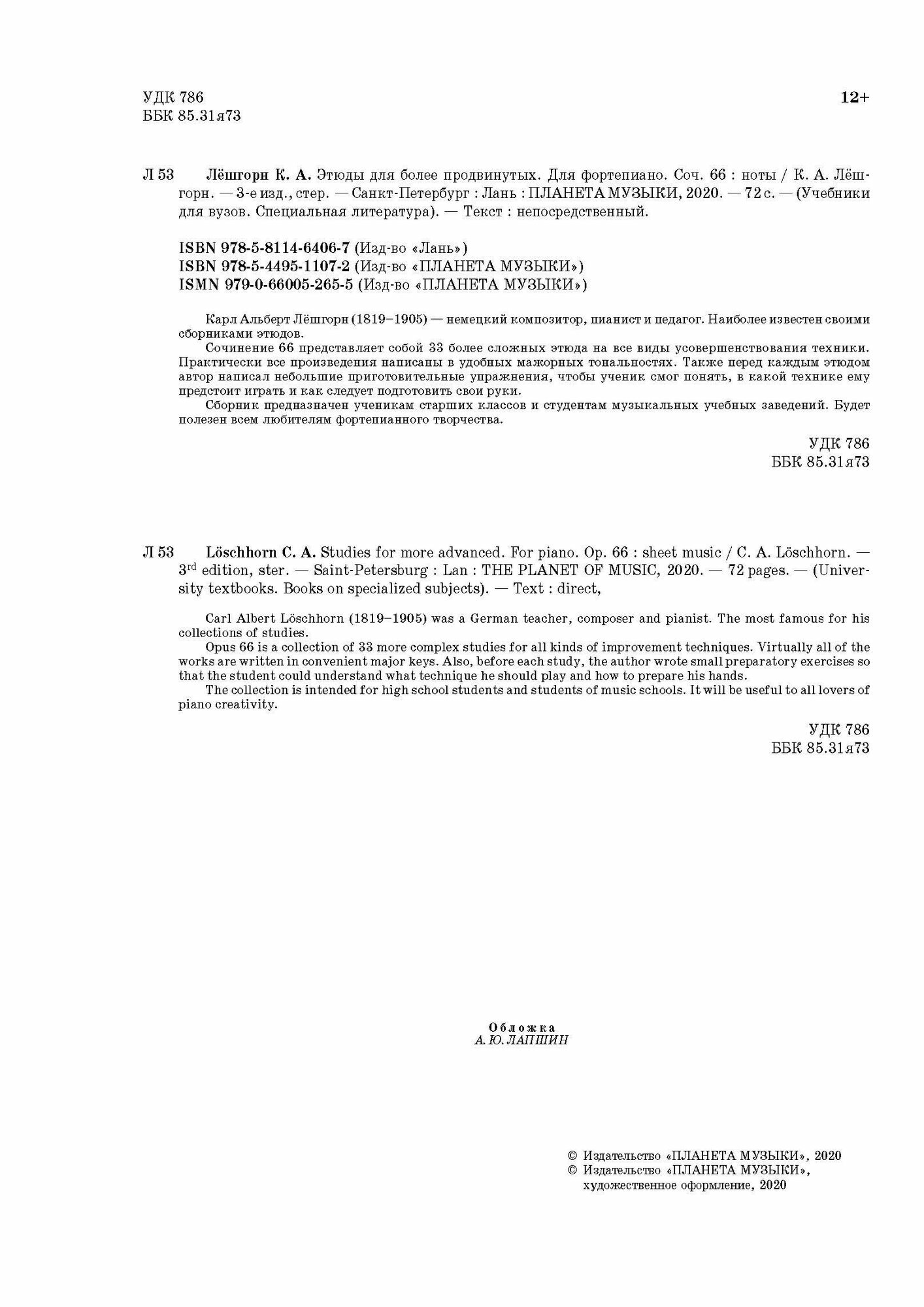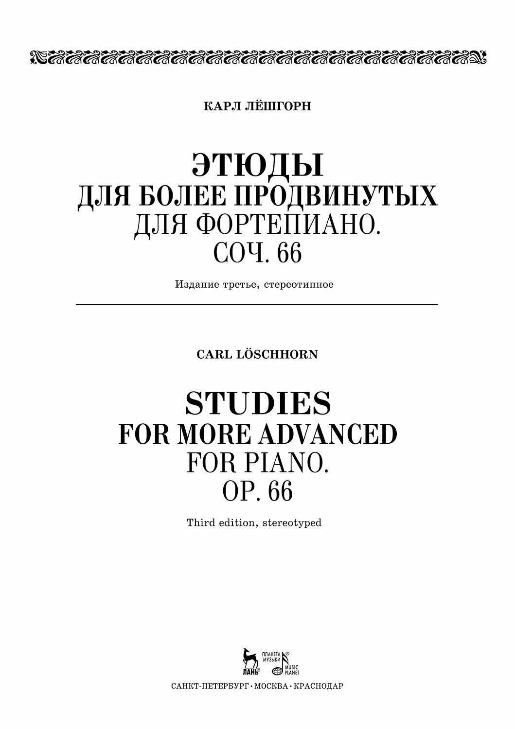 Этюды для более продвинутых. Для фортепиано. Соч. 66. (Карл Альберт Лёшгорн); Издательство «Планета музыки», 2020