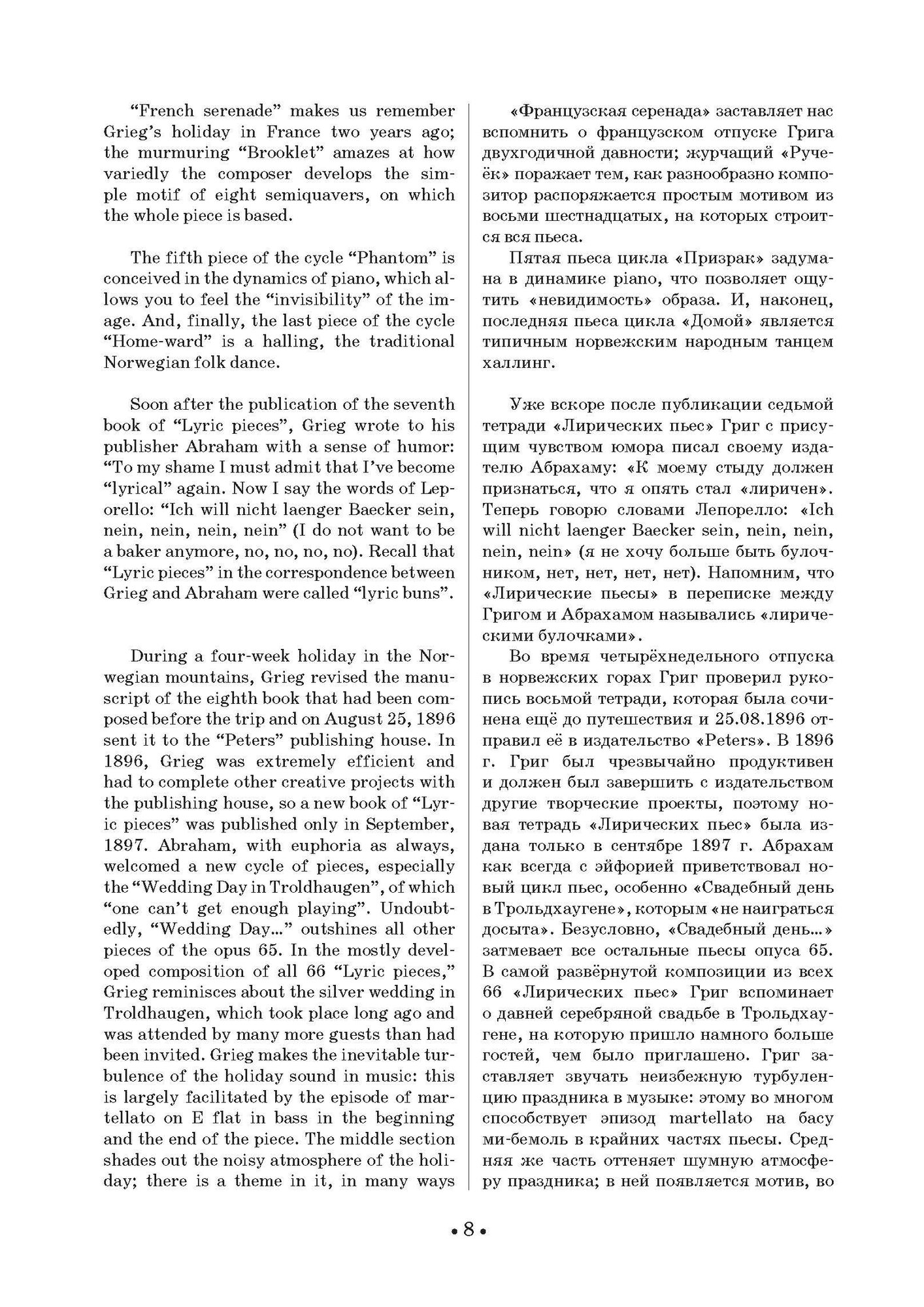 Эдвард Григ (1843–1907) – норвежский композитор периода романтизма, музыкальный деятель, пианист, дирижёр. «Лирические пьесы» составляют большую часть фортепианного творчества Грига (в десяти тетрадях цикла объединяются шестьдесят шесть фортепианных пьес). Произведения отличаются большим жанровым разнообразием: здесь встречаются элегия и ноктюрн, колыбельная и вальс, менуэт и баллада, ариетта и марш. Особенно часто обращается Григ к национальным норвежским жанрам – спрингдансам, халлингам, гангарам. Каждая из десяти тетрадей представляет собой самостоятельный сборник пьес, не связанных общим замыслом. Рекомендовано учащимся ДМШ, студентам фортепианных отделений музыкальных колледжей и вузов, пианистам, педагогам.