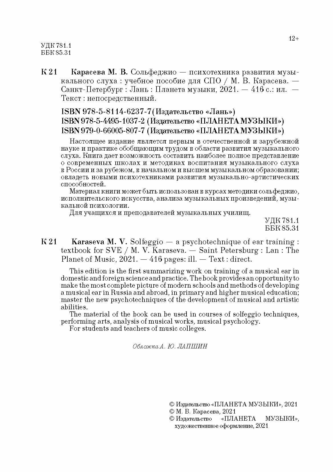 Сольфеджио — психотехника развития музыкального слуха (М. В. Карасева); Издательство «Планета музыки», 2022
