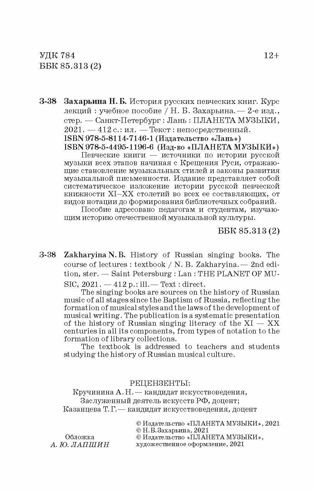 История русских певческих книг. Курс лекций (Н. Б. Захарьина); Издательство «Планета музыки», 2021