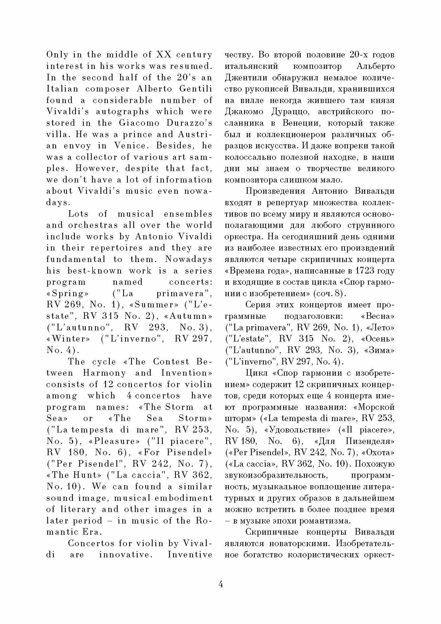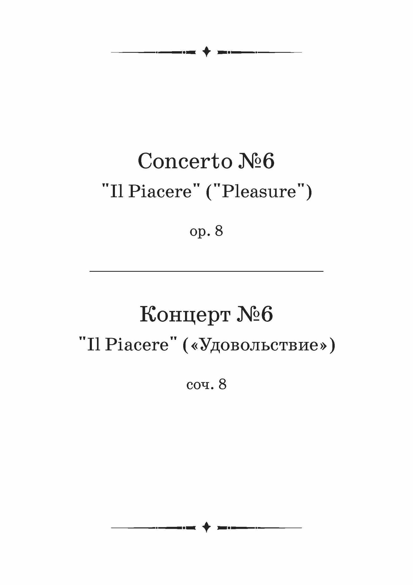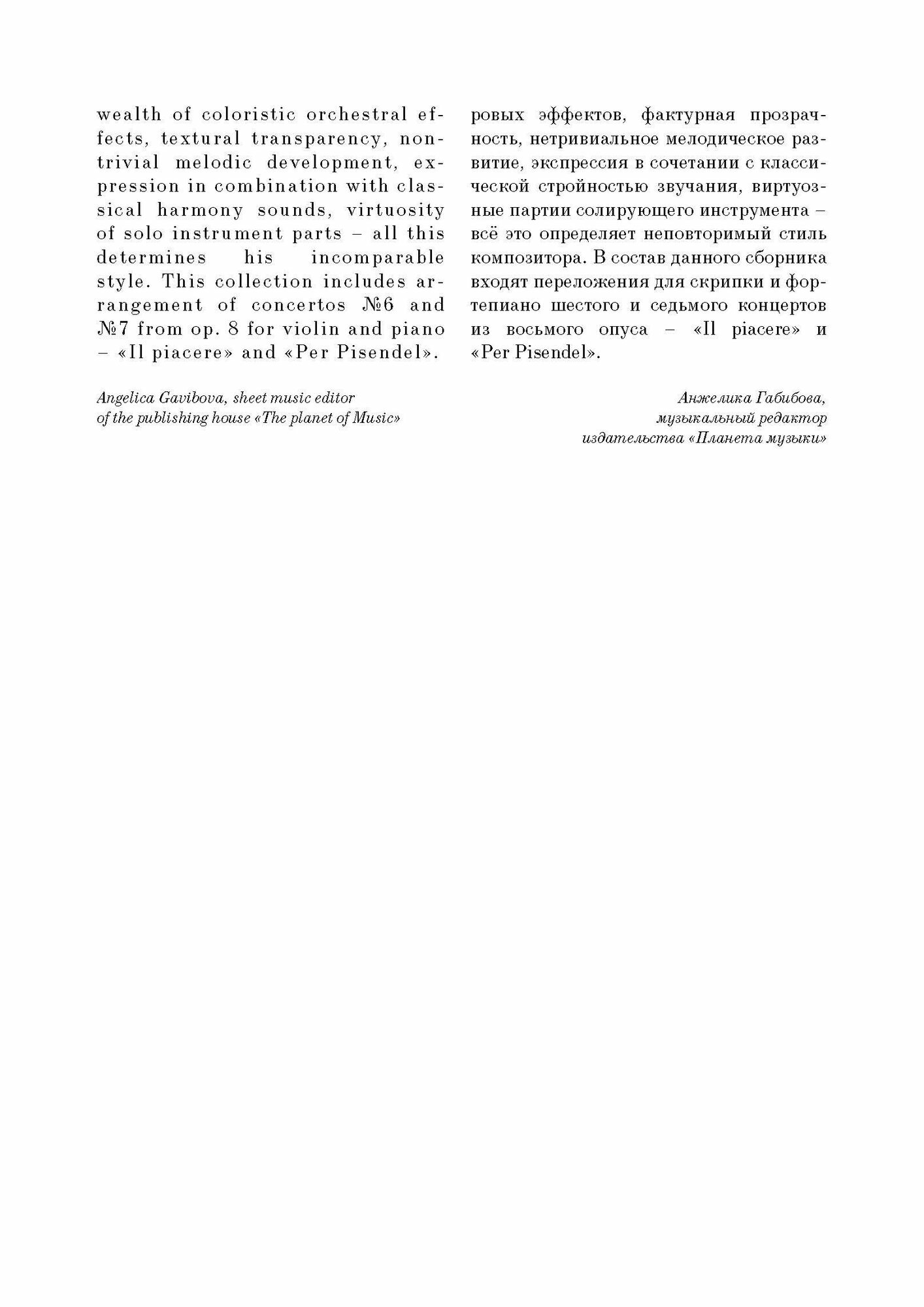 Цикл «Спор гармонии с изобретением» (итал. “Il cimento dell’armonia e dell’inventione”) выдающегося итальянского композитора Антонио Вивальди (1678–1741) состоит из 12 концертов для скрипки, струнного оркестра и баса континуо. В состав данного сборника входят впервые издающиеся в России переложения для скрипки и фортепиано шестого и седьмого концертов – «Il Piacere» и «Per Pisendel». Издание адресовано скрипачам и пианистам, студентам и педагогам исполнительских отделений специальных музыкальных школ, музыкальных училищ, колледжей и консерваторий.