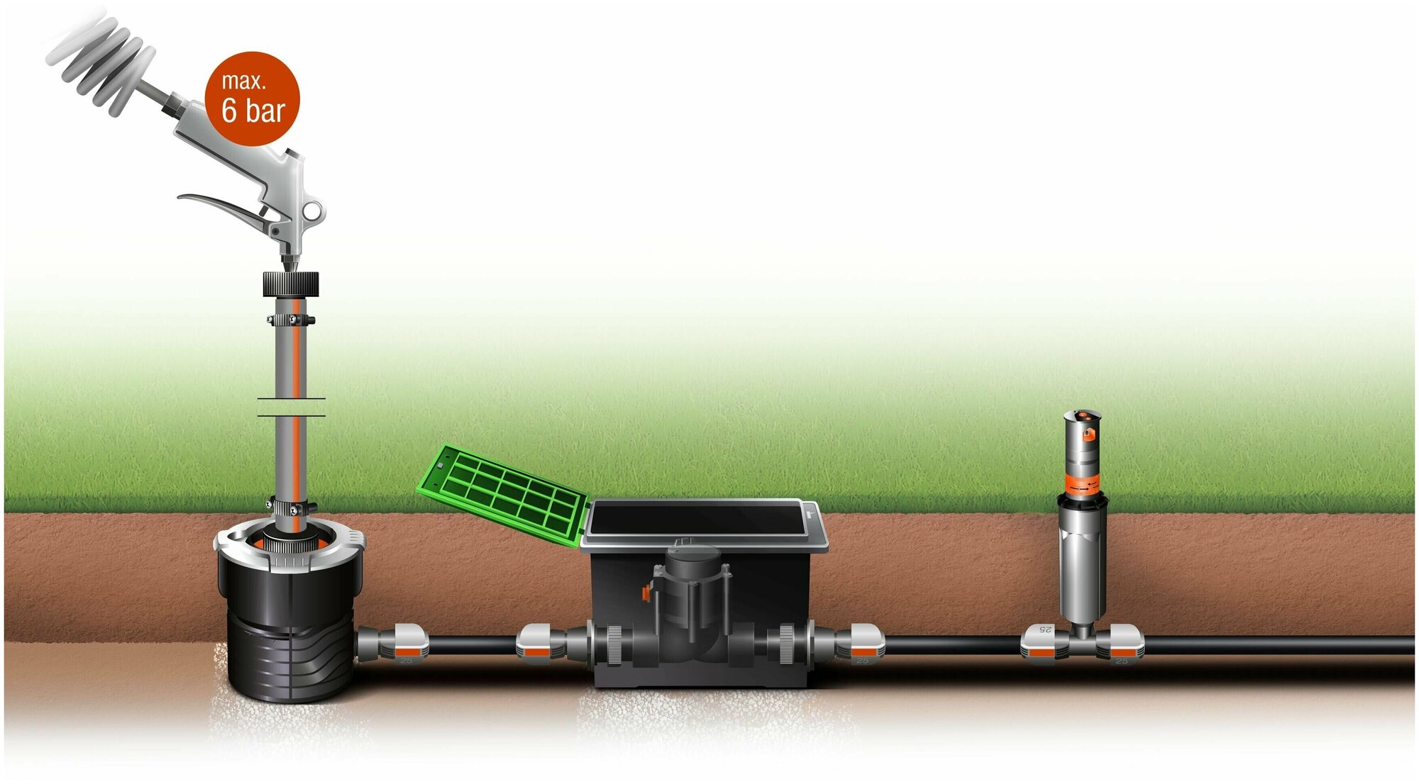 Выдвижной турбодождеватель GARDENA T 100, входящий в систему дождевания GARDENA Sprinklersystem, идеально подходит для орошения газонов небольших размеров, до 100 м2. Он может сочетаться с выдвижными турбодождевателями T 200 и 380 (арт. 8203-29 и 8205-29) и выдвижным осциллирующим дождевателем R 140 (арт. 1537-29). Дальность полива можно устанавливать в диапазоне от 4 до 6 м в соответствии с индивидуальной планировкой газона. Сектор полива плавно регулируется с помощью головки дождевателя в диапазоне от 70 до 360°. Поворотный регулятор позволяет точно задать сектор. Встроенный фильтр обеспечивает бесперебойное функционирование. Благодаря установке в трубопроводе дренажного клапана (арт. 2760-20) система дождевания становится морозоустойчивой. Соединение осуществляется при помощи внутренней резьбы 1/2".