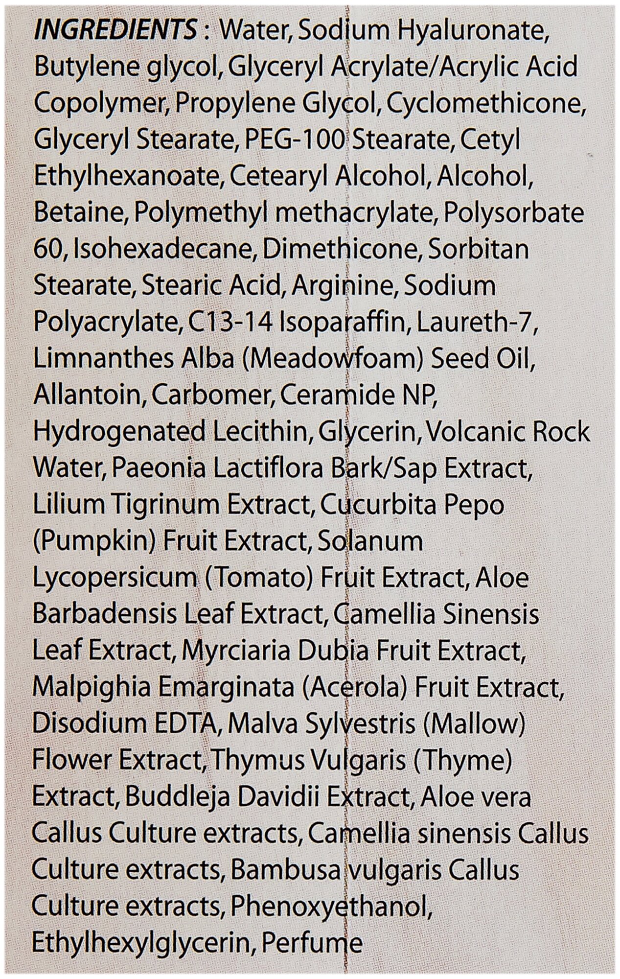 | Состав | water, sodium hyaluronate, butylene glycol, glyceryl acrylate/acrylic acid copolymer, propylene glycol, cyclomethicone, glyceryl stearate, peg-100 stearate, cetyl ethylhexanoate, cetearyl alcohol, alcohol, betaine, polymethyl methacrylate, polysorbate 60, isohexadecane, dimethicone, sorbitan stearate (or) sorbitan monostearate, stearic acid, arginine, sodium polyacrylate, c13-14 isoparaffin, laureth-7, limnanthes alba(meadowfoam) seed oil, allantoin, carbomer, ceramide 3, hydrogenated lecithin, glycerin, volcanic rock water, paeonia lactiflora bark/sap extract, lilium tigrinum extract, cucurbita pepo (pumpkin) fruit extract, solanum lycopersicum (tomato) fruit extract, aloe barbadensis leaf extract, camellia sinensis leaf extract, myrciaria dubia fruit extract, malpighia punicifolia (acerola) fruit extract, disodium edta, malva sylvestris (mallow) flower extract, thymus vulgaris (thyme) extract, buddleja davidii extract, aloe barbadensis leaf extract, camellia sinensis leaf extract, bambusa vulgaris leaf/stem extract, phenoxyethanol, ethylhexylglycerin, perfume |