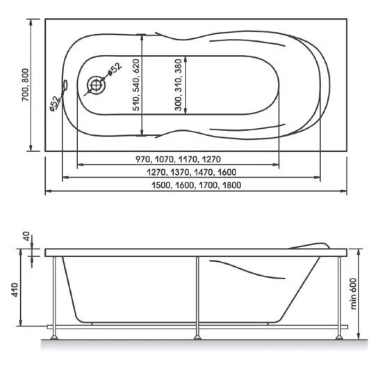Ванна без ножек/каркаса, без фронтального экрана, без слива перелива.