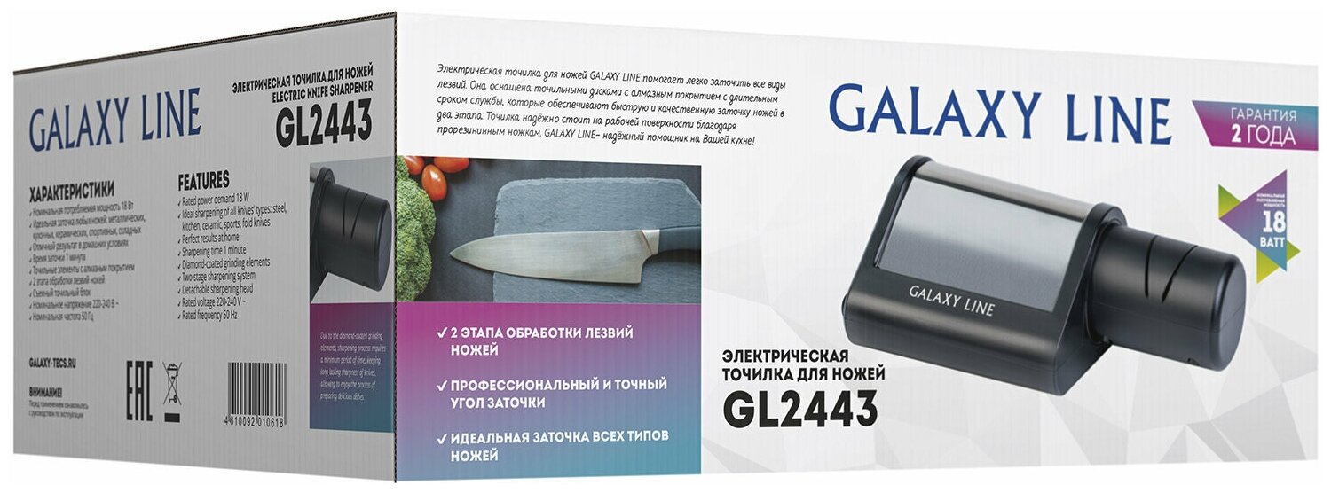 , Электрическая точилка для ножей GALAXY LINE GL2443 обеспечивает идеальную заточку всех типов ножей: металлических, кухонных, керамических, спортивных, складных. Высокоэффективные точильные элементы с алмазным покрытием обеспечивают качественную заточку даже таких деликатных типов ножей, как керамические. Профессиональный и точный угол заточки, позволяет добиться идеального результата в домашних условиях, и не требует специальных навыков и опыта заточки. Обработка лезвия ножа происходит в 2 этапа. Для этого точилка оснащена левой и правой прорезью. Убедитесь, что лезвие ножа вошло в плотный контакт с точильным кругом. Лезвие должно опираться на стенку прорези. Медленно проведите лезвие через прорезь в направлении от ручки ножа к кончику лезвия в течение 4-8 секунд. Точите нож, повторяя форму его лезвия. Не давите на нож в процессе затачивания, прилагайте минимальные усилия. После завершения процесса тщательно вымойте нож, используя ткань и моющее средство для удаления возможного налета и стружки, появившихся в результате затачивания. Для равномерной заточки следует точить лезвие поочерёдно в правой и в левой прорезях до тех пор, пока нож не станет острым. Как правило, около 5 проходов будет достаточно, но для ножей высокой твёрдости и керамических ножей потребуется около 10 проходов. Точилка GALAXY LINE имеет прорезиненные ножки, которые надежно фиксируют прибор на рабочей поверхности, препятствуя скольжению. Дополнительный комфорт в работе и хранении прибора обеспечивает съемный точильный блок. Электрическая точилка для ножей GALAXY LINE GL2443 станет надежным помощником на Вашей кухне!
