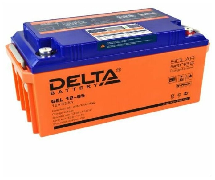 Свинцово-кислотный аккумулятор Delta напряжением 12В и емкостью 65Ач изготовлен по технологии AGM+GEL: combined AGM and GEL technology (частичное сгущение электролита). Устойчив к глубоким разрядам. Дополнительно аккумулятор оснащен LCD дисплеем, отображающем различные статусы работы аккумулятора. Корпус изготовлен из негорючего ABS пластика. Срок службы аккумулятора достигает 10-12 лет. Аккумулятор предназначен для работы в режиме постоянного подзаряда (буферный режим) или в режиме разряд-заряд (циклический режим). Обладает низким внутренним сопротивлением и саморазрядом.