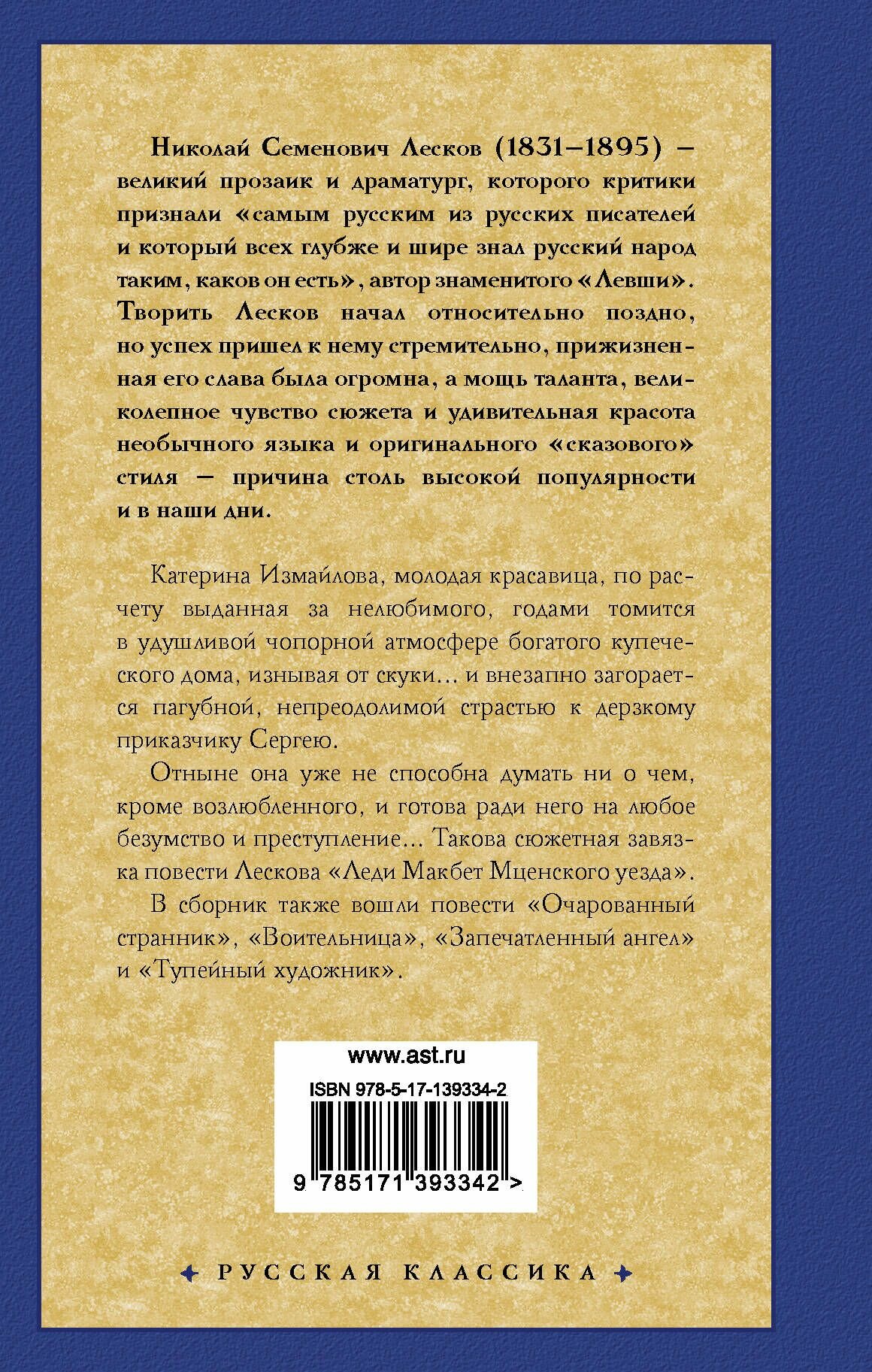 Впервые я познакомилась с творчеством Лескова, прочитав его повесть «Леди Макбет Мценского уезда». Она меня очень удивила, мне понравилось, что Лесков в небольшом количестве страниц может донести такую историю. Все ёмко и интересно. Советую купить это издание, потому что в этой книге собраны несколько повестей Лескова.