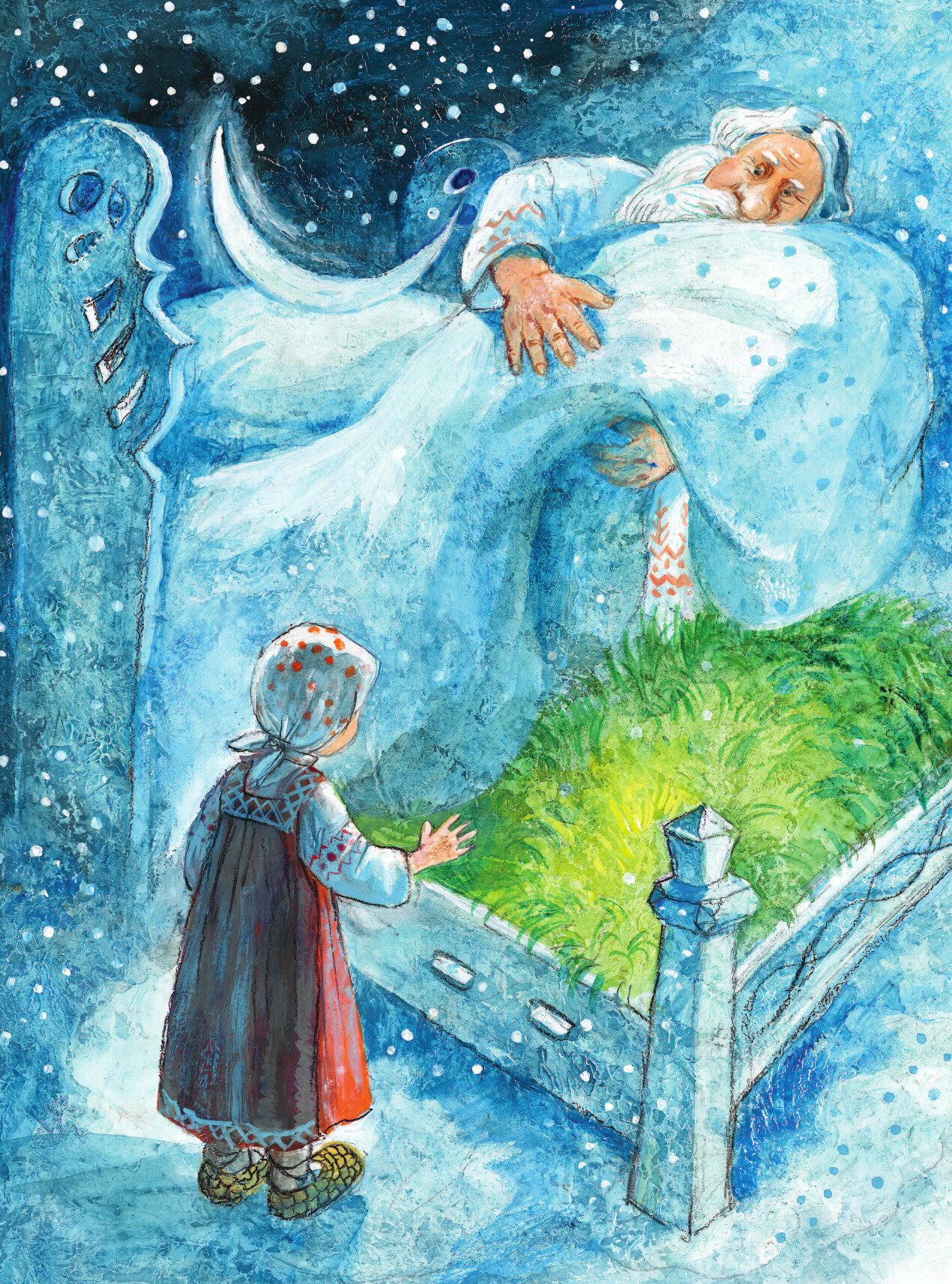 Тематика не новогодняя, но зимняя. Три сюжета о Морозах. Истории классические, со смыслом. Есть речевая стилизация. Морозы изображены величавыми, а не придурковатыми, как это сейчас модно. Цветовая гамма бело-синяя, холодная. Очень красиво проработаны детали.