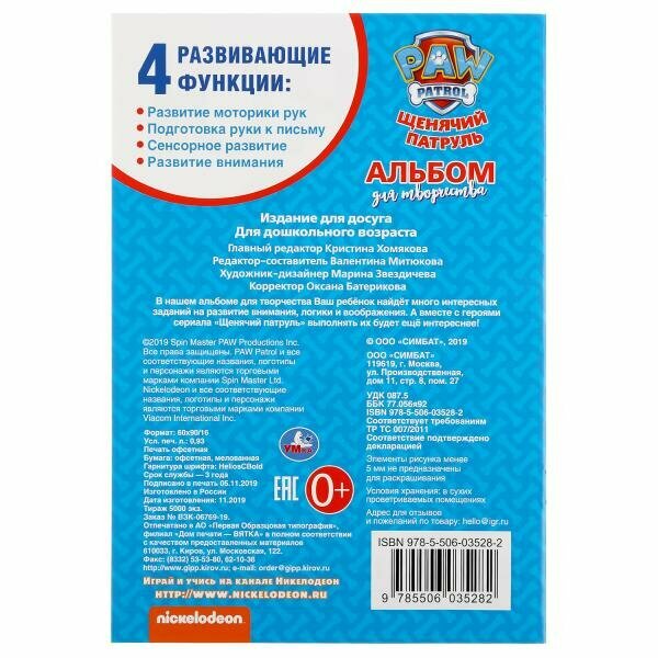 НАСТОЯЩИЕ СПАСАТЕЛИ. ЩЕНЯЧИЙ ПАТРУЛЬ (АЛЬБОМ ДЛЯ ТВОРЧЕСТВА А5) 145Х210ММ. 16 СТР в кор.50шт 978-5-506-03528-2; СИМБАТ ООО