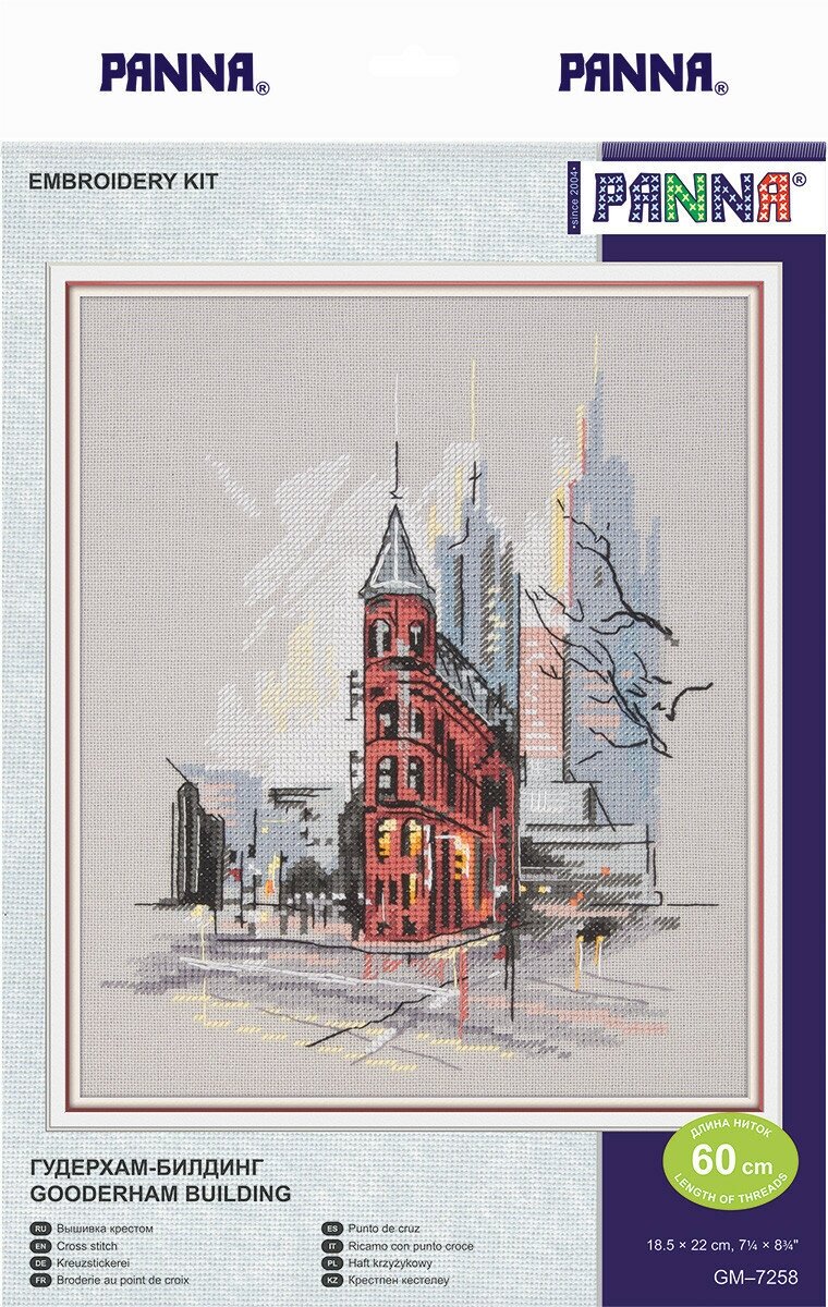 Набор для вышивания "PANNA" GM-7258 "Гудерхам-билдинг" 18,5x22 см. Набор для вышивания включает все, что необходимо для создания шедевра своими руками: канва Zweigart K32 Murano, хлопчатобумажные нитки мулине "Gamma" на держателе, игла "Gamma" для вышивания, подробная инструкция по вышиванию и цветная схема. Гудерхам-билдинг также известен как Дом-утюг из-за своей формы, Это историческое офисное здание находится в Канаде, в городе Торонто. Все материалы высокого качества, с которыми удобно работать, а результатом работы с которыми - можно только наслаждаться. Заполнение: Частичное. Кол-во цветов: 18. Уровень сложности: 3
