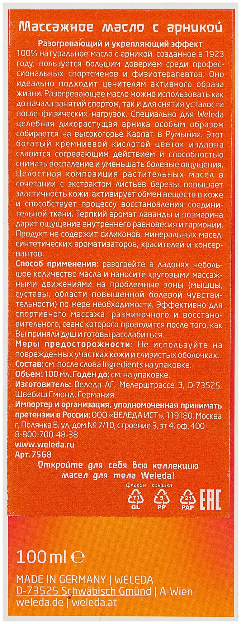| Полное наименование | WELEDA Массажное масло с арникой 100 мл |