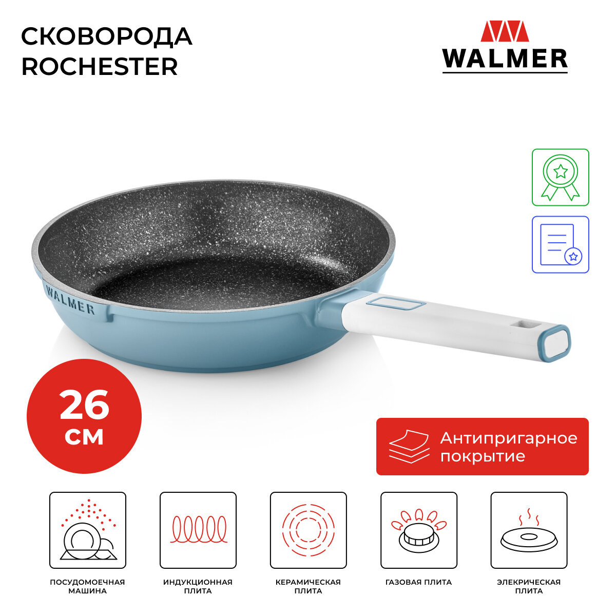 Сковородки редко выглядят модно, но новая серия Rochester известной британской компании Walmer — именно такой случай. Внешняя часть корпуса окрашена в непривычный для этой посуды голубой цвет и украшена массивным литым логотипом. Walmer Rochester — сковороды для стильных кухонь!