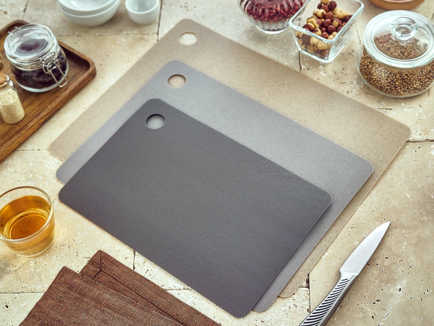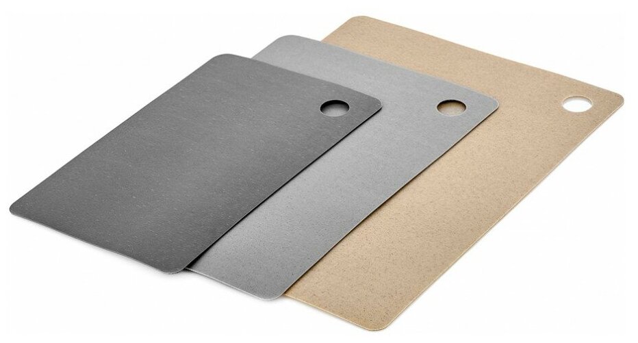 Доски сделаны из термостойкого биопластика и входят в коллекцию посуды, изготовленную из продуктов, не наносящих вреда природе. В набор входят доски оптимального размера 38x29 см, 33x24 см, 29x19 см., на таких досках удобно резать овощи, разделывать рыбу или птицу, нарезать хлеб.