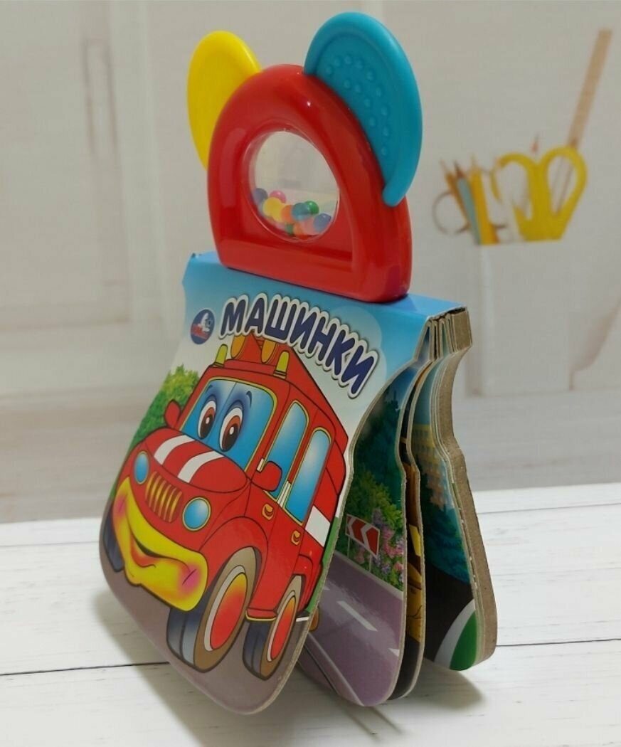 Яркий необычный дизайн с гремящими разноцветными шариками и прорезывателями в виде ушек обязательно привлечёт внимание ребёнка и сделает эту книгу одной из любимых его игрушек. А интересное содержание и занимательные картинки познакомят малыша с разными машинками. Благодаря компактному размеру книжку удобно брать собой на прогулки или в поездки.