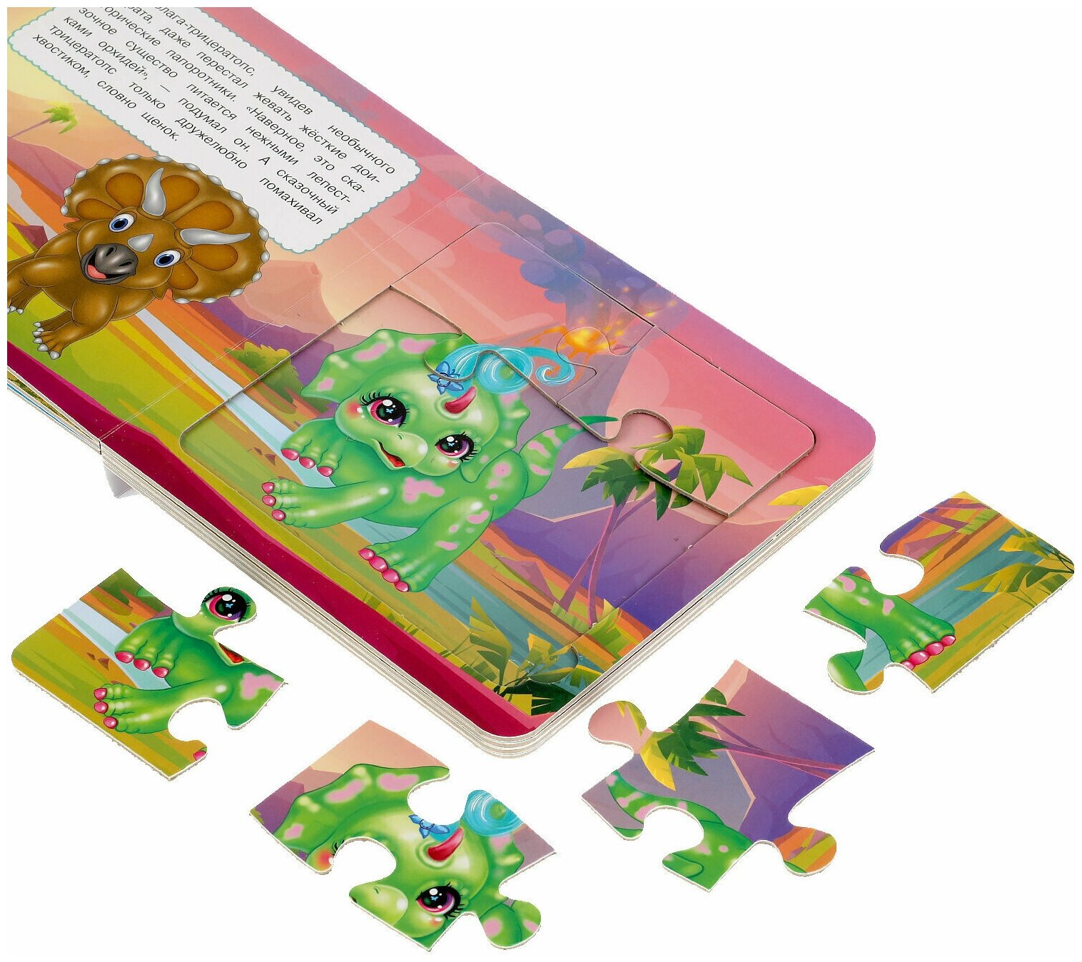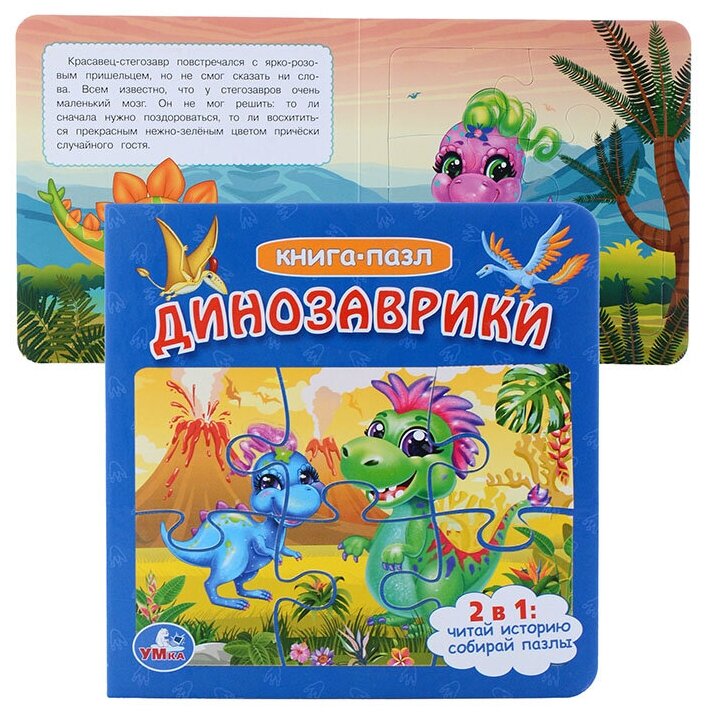 Данная книга выполняет сразу 2 функции: это и книга для чтения, и игра в пазлы. На каждом развороте малыша ждёт интересное повествование и яркий пазл с изображением милых персонажей - динозавриков. Книжка изготовлена из плотного картона, поэтому мамы могут не опасаться, что ребёнок порвёт странички. Благодаря удобному формату книгу можно взять с собой в дорогу.