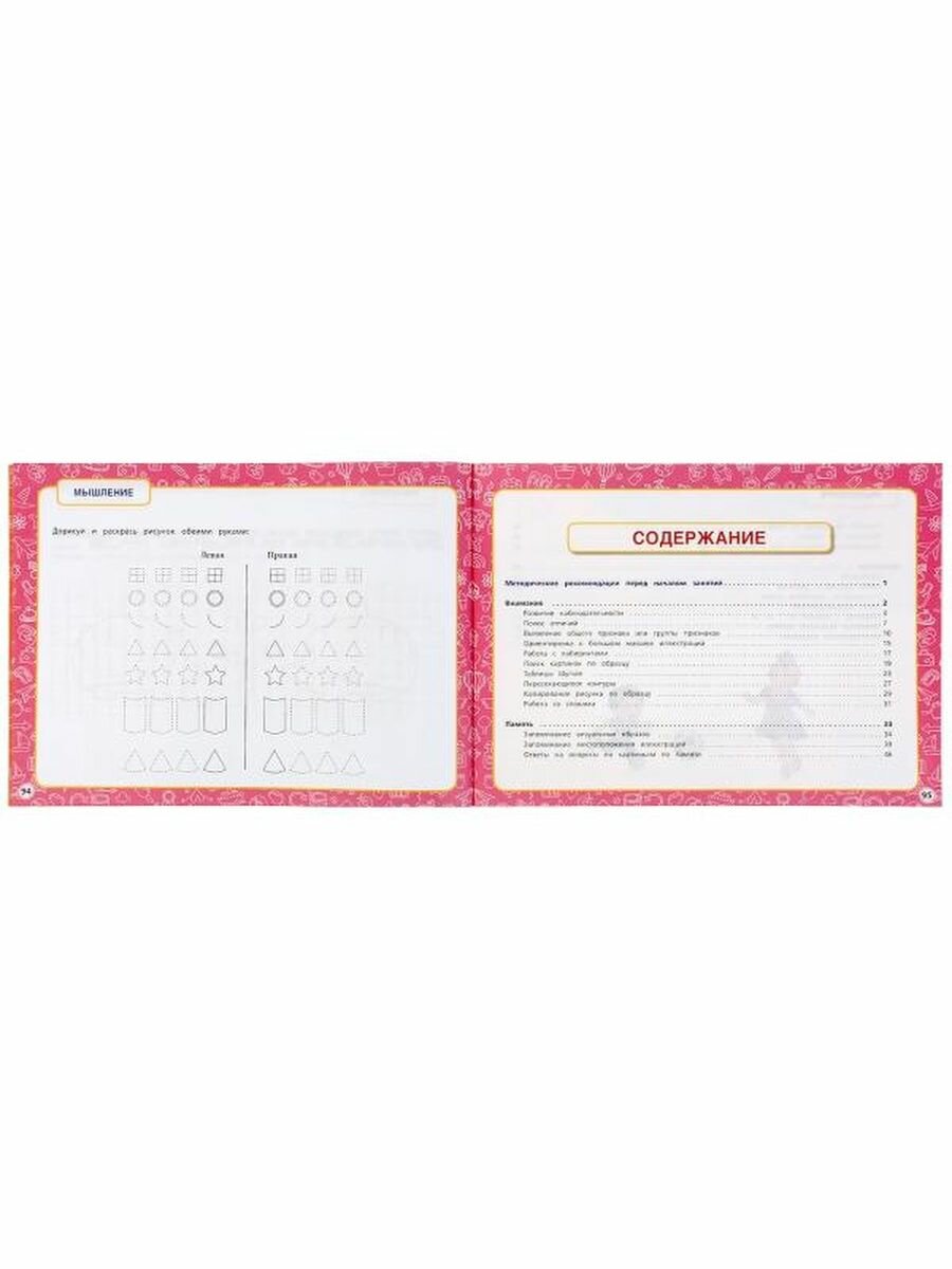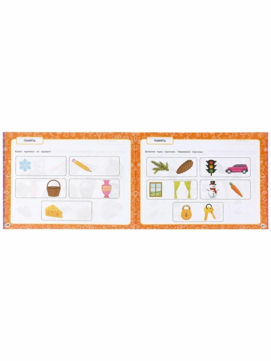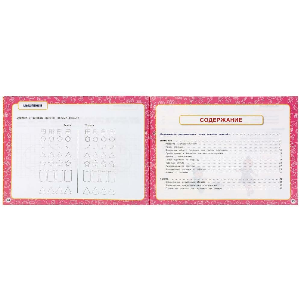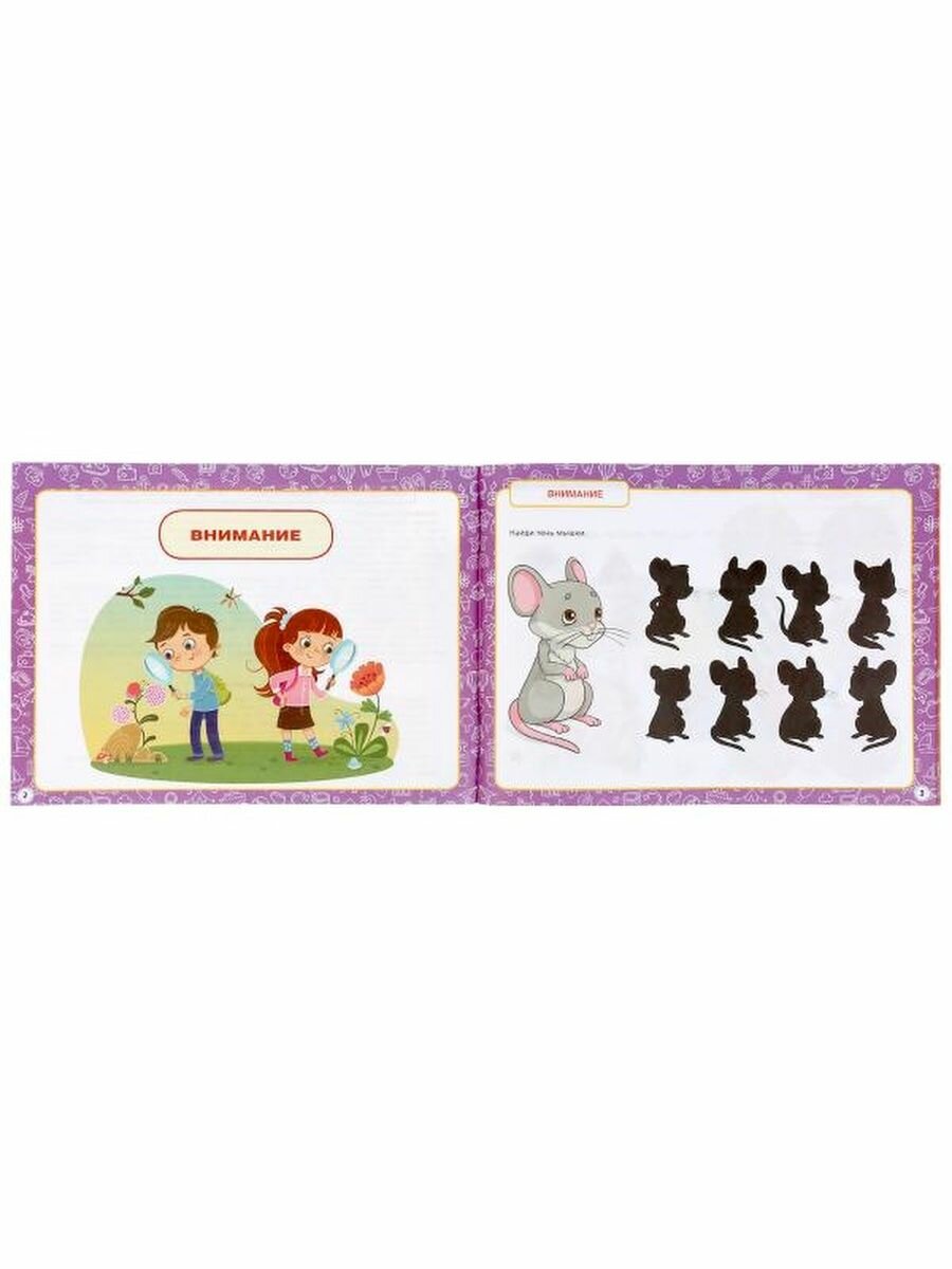 - в содержании: методические рекомендации, упражнения на развитие внимания (поиск отличий, работа с лабиринтами, таблицы Шульте и т.д.), памяти (запоминание визуальных образов, местоположения иллюстраций, ответы на вопросы по картинкам по памяти) и мышления