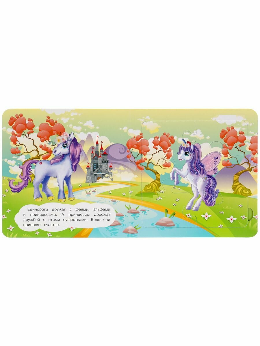 Данная книга выполняет сразу 2 функции: это и книга для чтения, и игра в пазлы. На каждом развороте малыша ждёт интересное повествование и яркий пазл с изображением волшебных существ - единорогов. Книжка изготовлена из плотного картона, поэтому мамы могут не опасаться, что ребёнок порвёт странички. Благодаря удобному формату книгу можно взять с собой в дорогу.
