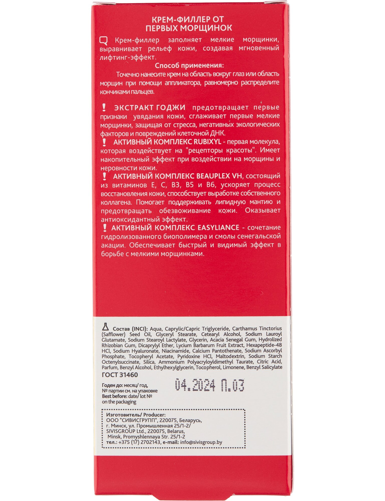 Крем-филлер заполняет мелкие морщинки, выравнивает рельеф кожи, создавая мгновенный лифтинг-эффект. Экстракт ягод годжи предотвращает первые признаки увядания кожи, сглаживает первые мелкие морщинки, защищая от стресса, негативных экологических факторов и повреждений клеточной ДНК. Активный комплекс Rubixil - первая молекула, которая воздействует на "рецепторы красоты". Имеет накопительный эффект при воздействии на морщины и неровности кожи. Активный комплекс Beauplex VH, состоящий из витаминов E, C, B3, B5 и B6, ускоряет процесс восстановления кожи, способствует выработке собственного коллагена. Помогает поддерживать липидную мантию и предотвращать обезвоживание кожи. Оказывает антиоксидантный эффект. Активный комплекс Easyliance - сочетание гидролизованного биополимера и смолы сенегальской акации. Обеспечивает быстрый и видимый эффект в борьбе с мелкими морщинками.