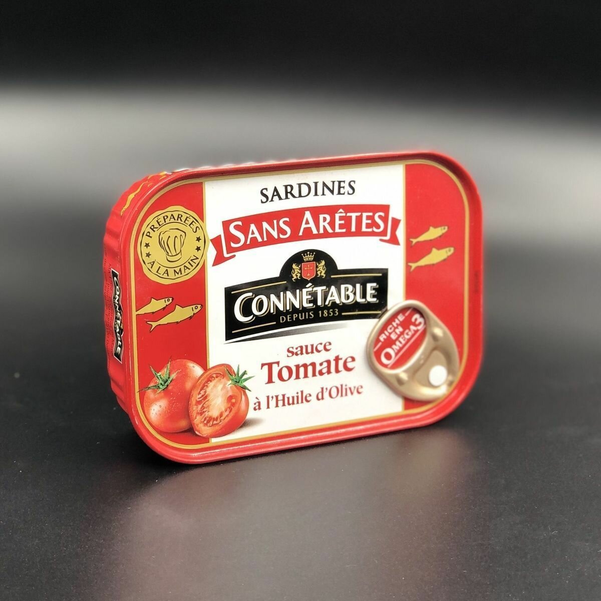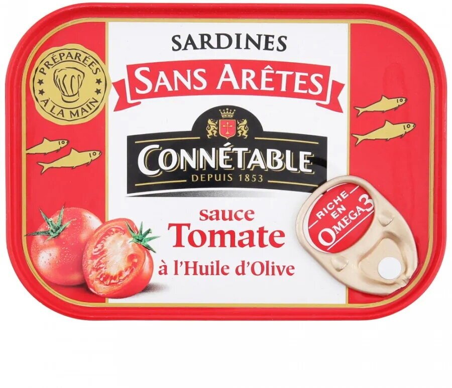 Sardines Sans Aretes Connetable sauce Tomate a’Huile d’Olive⠀⠀Польза сардины в томатном соусе для организма человека неоспорима. Сардина в томатном соусе содержит в своем составе томатную пасту, которая усиливает полезные свойства рыбы.⠀⠀Филе такой рыбы содержит в большом количестве рыбий жир, антиоксиданты, а также жирные кислоты ненасыщенного характера ряда омега-3.⠀⠀Среди витаминов в сардине известны витамины группы B, а также D и A.⠀Основные макро- и микроэлементы входящие в состав сардин – это соли цинка, фтора (в большом количестве), калия, кальция, фосфора, необходимые для укрепления костной ткани, а также йод и магний.⠀⠀Сочетание этих веществ, благотворно влияет на иммунитет, метаболизм, а также оказывает оздоровительное действие на организм.⠀