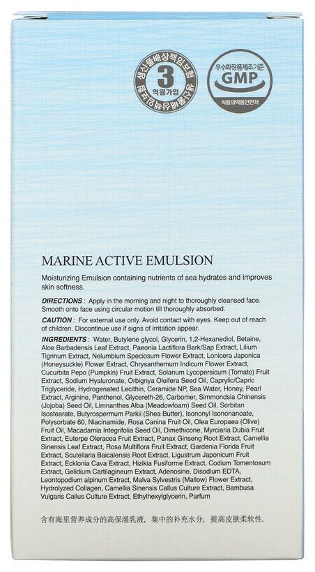 Гиалуроновая кислота и керамид III в составе средства увлажняют и укрепляют кожу. Благодаря этим компонентам, эмульсия питает и насыщает влагой даже глубокие слои кожи. А за счет содержания глубинной воды и экстракта морских водорослей, кожа быстрее впитывает и поглощает полезные вещества, заряжаясь силой и энергией, становясь увлажненной и сияющей. Эмульсия быстро впитывается, без ощущения липкости, оставляя после себя чувство свежести в течении долгого времени.