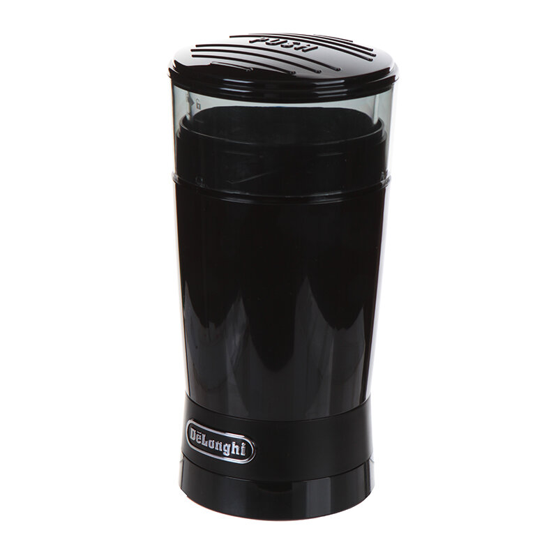 Компактная кофемолка DeLonghi KG200 имеет пластиковый корпус и прочные жернова из нержавеющей стали. Прибор имеет съемную пластиковую чашу. Нажав сверху на кнопку Push to grind можно включить перемалывание.