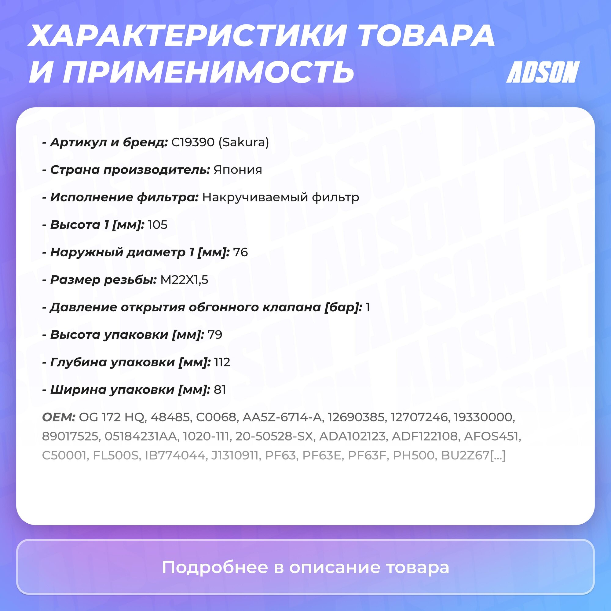 Тип товара: Фильтры автомобильные