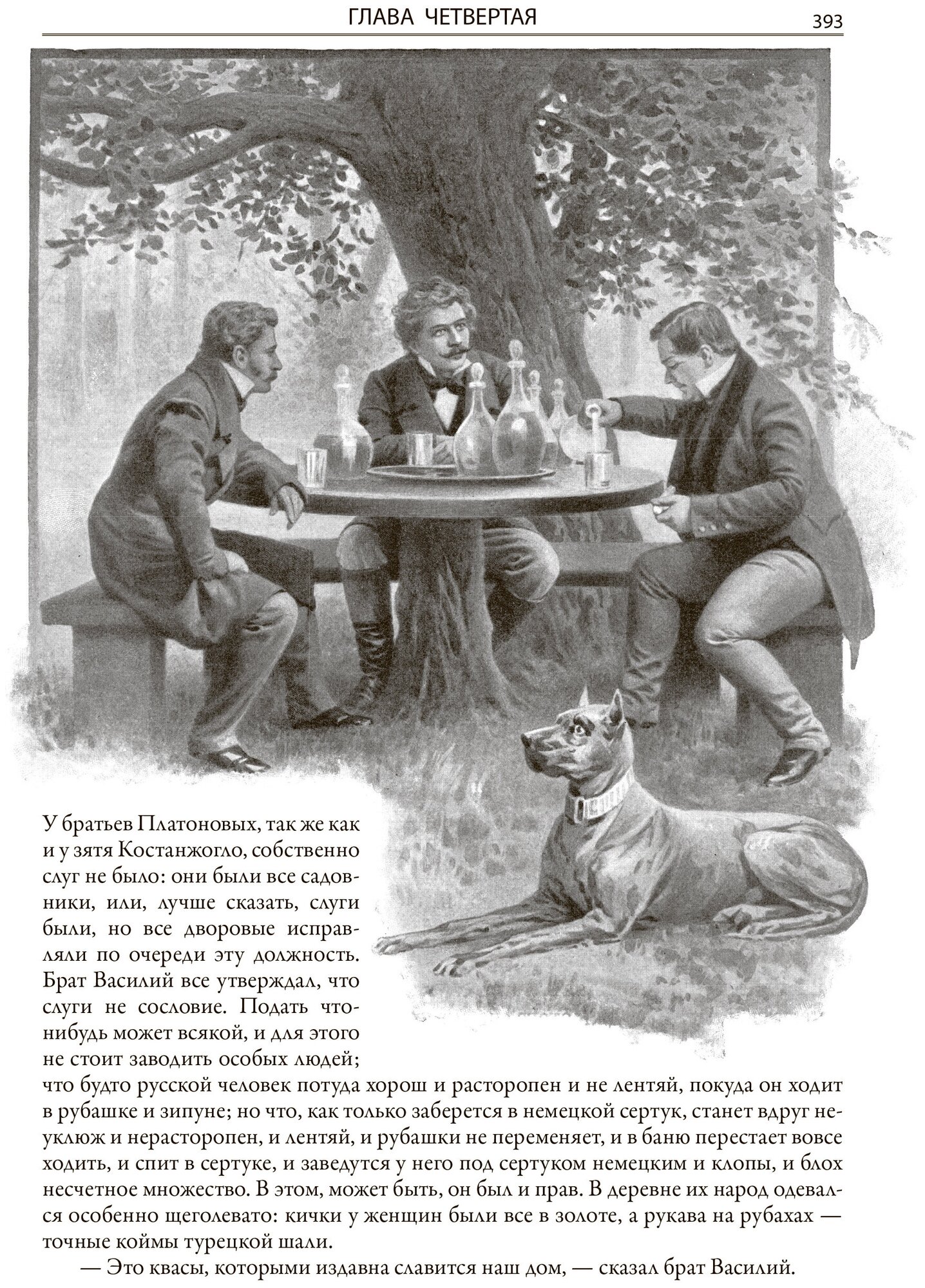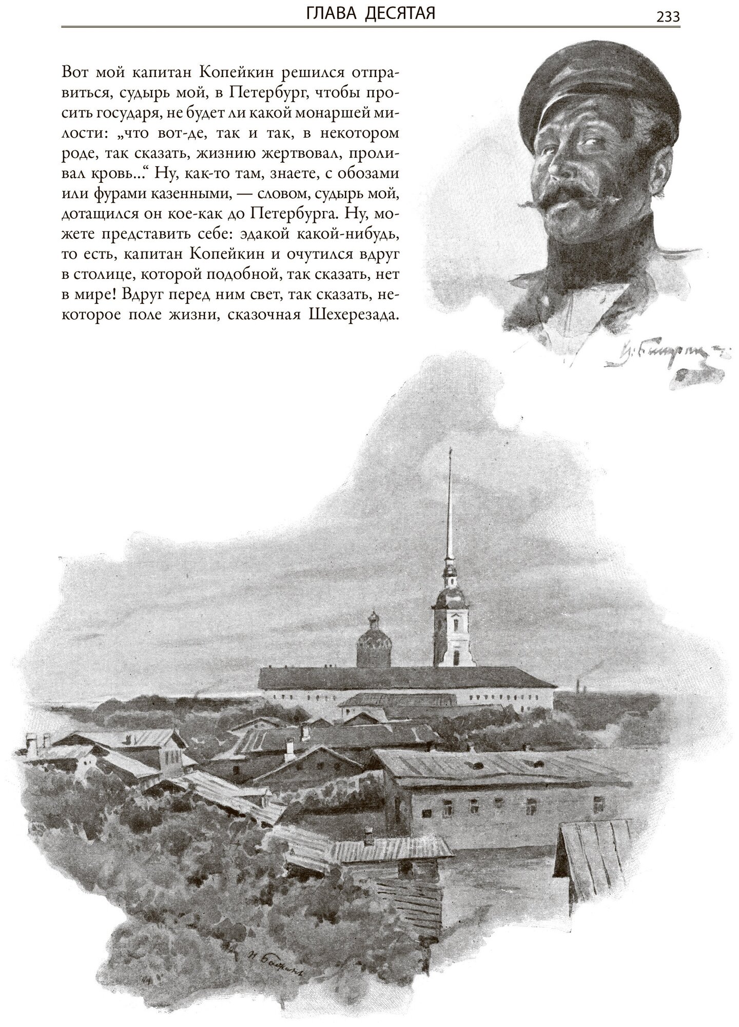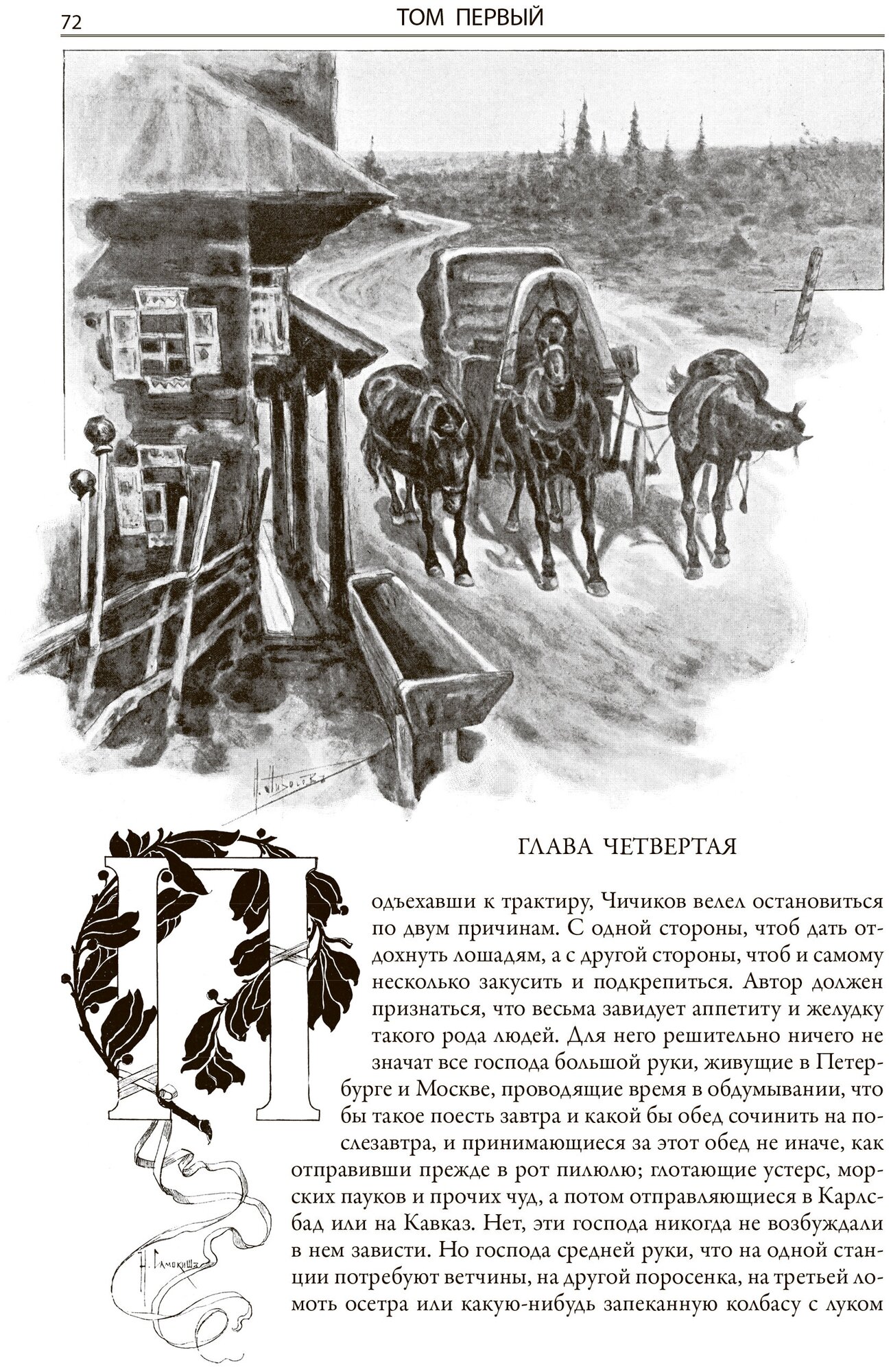 В настоящее издание вошли полный текст первого тома "Мертвых душ", глава из приложений к первому тому и позднейшая редакция неоконченного второго тома. Немалый интерес вызывают и использованные в оформлении рисунки. В 1901 году петербургский издатель Адольф Федорович Маркс осуществил роскошное иллюстрированное издание поэмы. К работе над ним была привлечена большая группа талантливых художников, работавших по единому замыслу; руководили творческим коллективом искусствовед Петр Петрович Гнедич и живописец Мечислав Михайлович Далькевич. Художники сделали 365 замечательных иллюстраций: В. А. Андреев, А. Ф. Афанасьев, В. И. Быстренин, М. М. Далькевич, Ф. С. Козачинский, И. К. Маньковский, Н. В. Пирогов и Е. П. Самокиш-Судковская воспроизвели бытовые сцены произведения, Н. Н. Бажин и Н. Н. Хохряхов исполнили пейзажи, а Н. С. Самокиш - буквицы и виньетки.