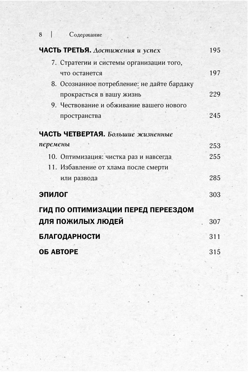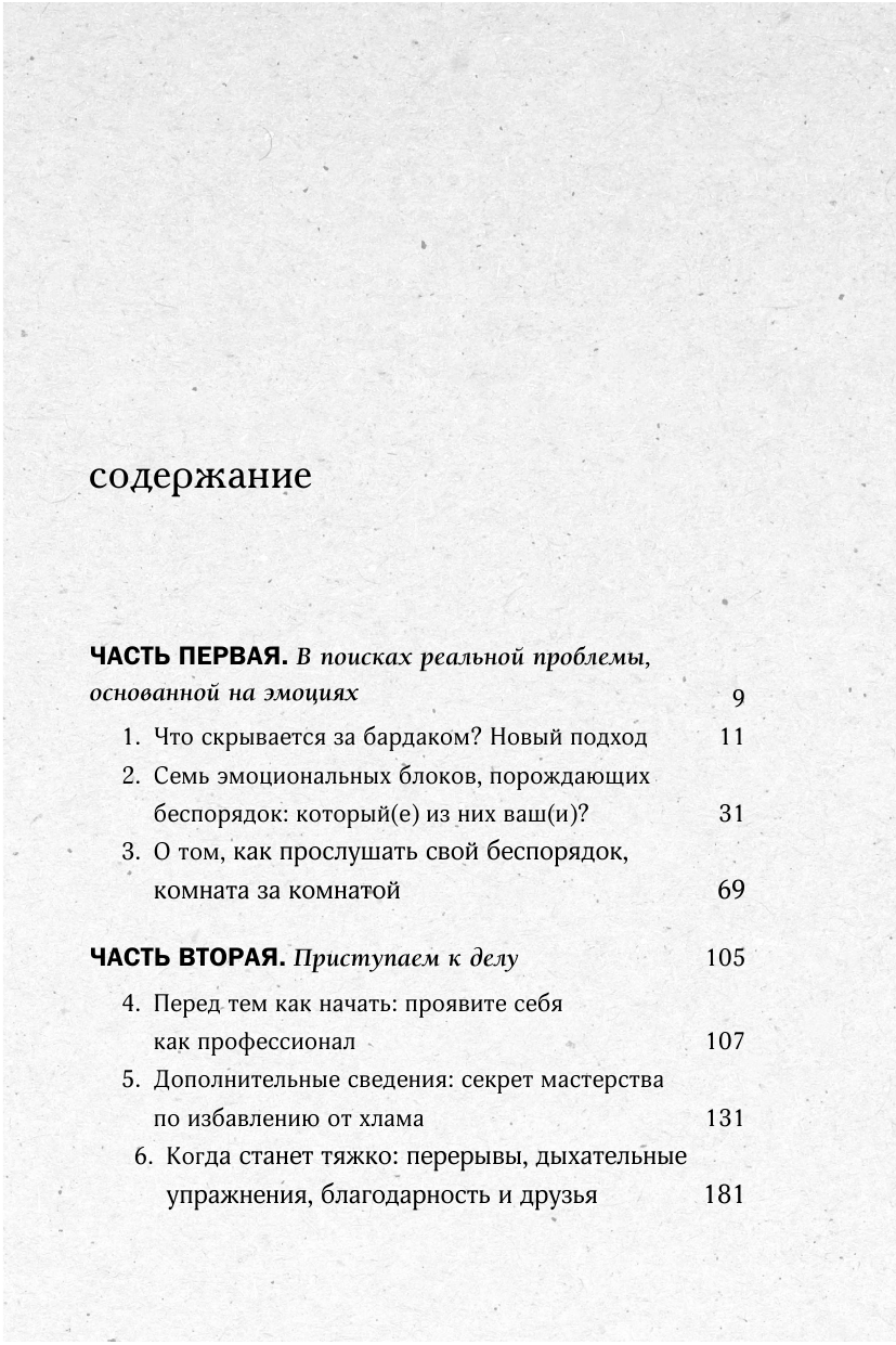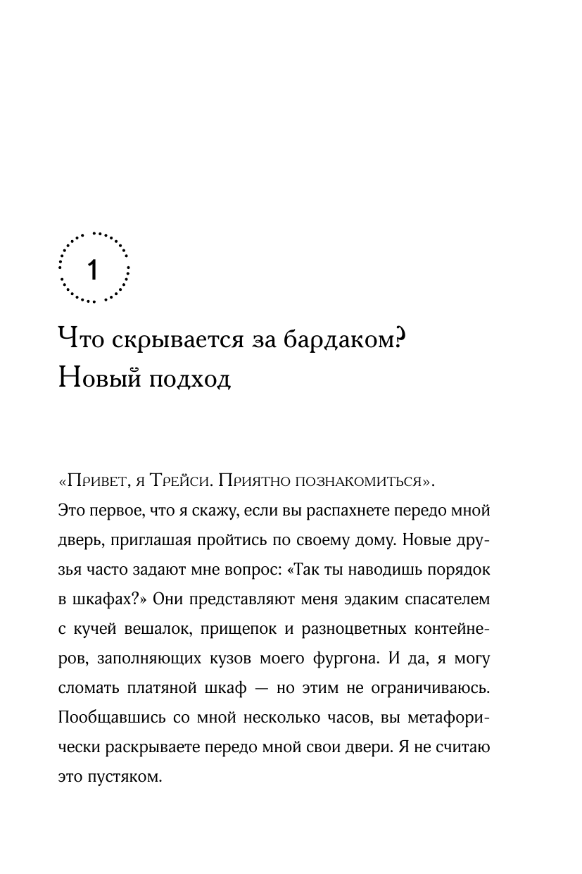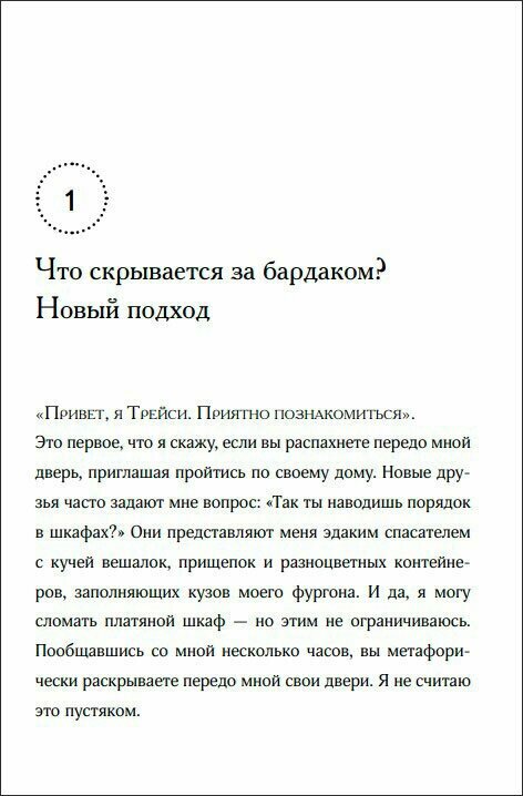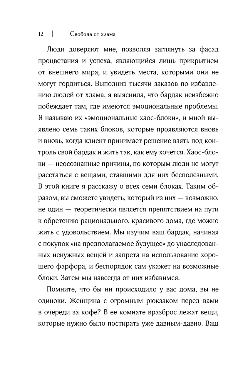 Эта книга, по моему мнению, является лучшей по данной теме. Она написана женщиной, но не содержит никаких размышлений в стиле "Как быть хорошей хозяйкой/женой/матерью". Эта книга подойдет всем людям, независимо от пола, образования, профессии, карьеры, наличия детей и т.д. Ее не стыдно обсудить не только с домохозяйками, но и с серьезными нацеленными на карьеру друзьями. Наверное, единственная такая книга, которую я могу посоветовать мужчине. В отличие от "Магической уборки" Мари Кондо ("Приносит ли тебе эта вещь радость?") в книге нет какого-то мечтательного флера, идущего от раннего подросткового возраста. Автор разбирает 7 эмоциональных блоков, порождающих беспорядок и накопление реально не используемых вещей, и представляет вопросы для определения нужности хранения вещей, чтобы их "обслуживание" не отвлекало от действительно важных в жизни задач. При этом автор рассказывает о своей методике избавления от хлама с доброжелательностью, описывает примеры из своей практики работы с разными людьми (мужчины и женщины разных профессий, разные судьбы, разные семейные положения и т.д.), с пониманием относится к жизненным ситуациям, приведших людей к накоплению лишнего и неорганизованности. Также автор не настаивает на использовании каких-то экологичных самодельных средств для уборки/стирки или слишком радикального сокращения вещей до минимума исходя из своего какого-то представления о необходимости (например, 1 флакон моющего средства для тела, лица, волос и т.д.). Автор не составляет свой универсальный список вещей для всех людей, уважительно относится к раличиям между людьми (стиль жизни, привычки, удобное, рекомендации врачей и т.д.).