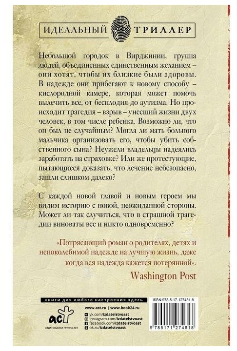 Я еще книгу не дочитала, но мое мнение вполне сложилось. Это не триллер с кучей леденящих потробностей, горой трупов и маньяком убийцей в подворотне. Но трупы здесь есть, людей, которые погибли при пожаре. Книга похожа по жанру на судебно адвокадский детектив: ведется допрос, есть подозреваемый, но он ли виновник на самом деле? Главы написаны от лица разных участников и почти все они лгут, лгут себе, меняют показания, но, что они скрывают, предумышленное убийство или что то другое? Тема детей инвалидов -табу, об этом предпочитают стыдливо молчать и мало кто представляет каково это быть матерью ребенка аутиста. Тяжело об этом читать, но вместе с тем это удивительно, как мать может любить своего ребенка несмотря ни на что... прочтите эту книгу и вы поймете на некоторое время каково это. Есть в книге и тема эммиграции, про тех кто уехал из Кореи в поисках лучшего будушего и как это непросто подстроить свой менталитет в другой стране.. Мне книга очень нравится, прочтите ознакомительный эпизод, может быть и вас затянет...