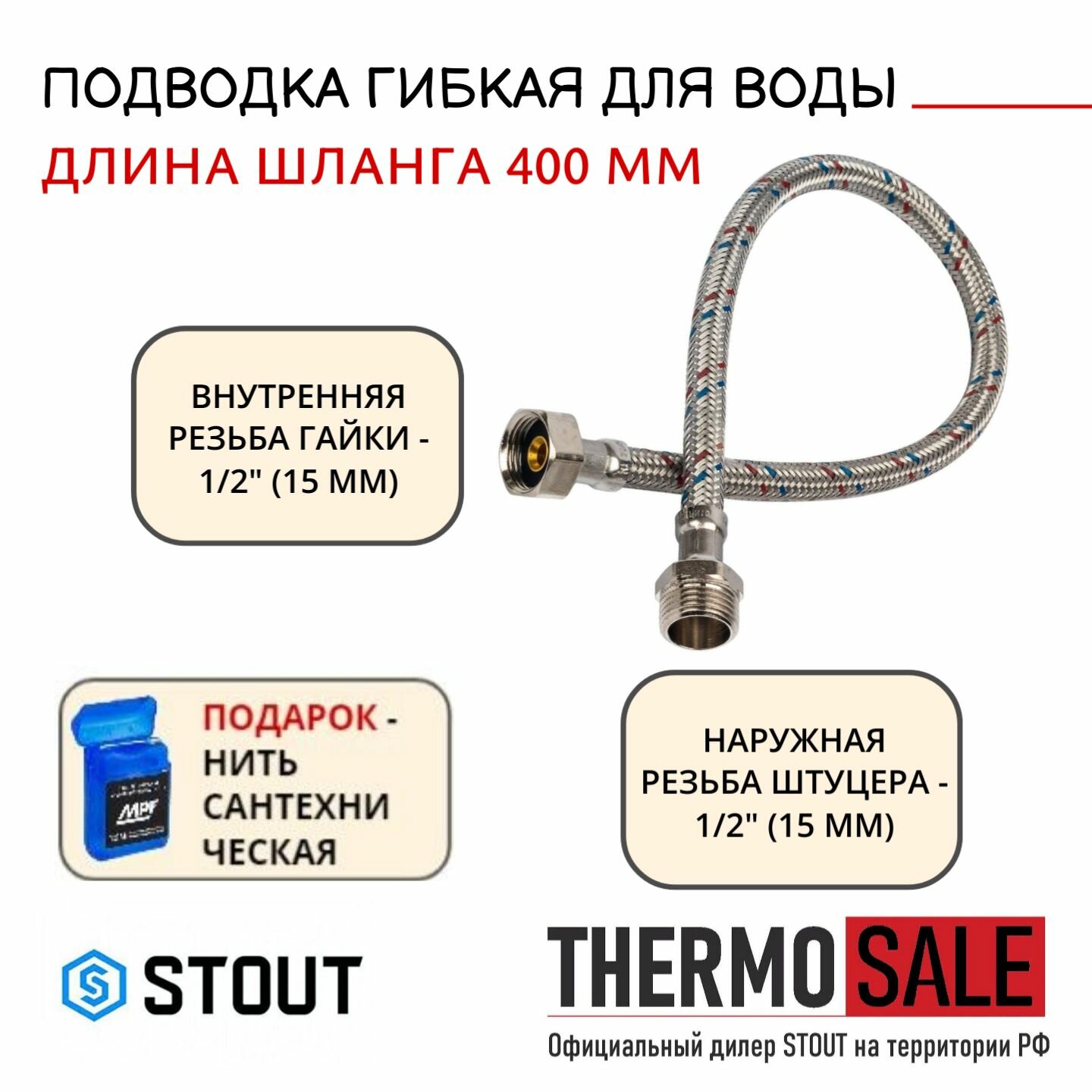 Гибкая подводка для воды STOUT SHF-НВ НР 1/2 х ВР 1/2, 1000 мм