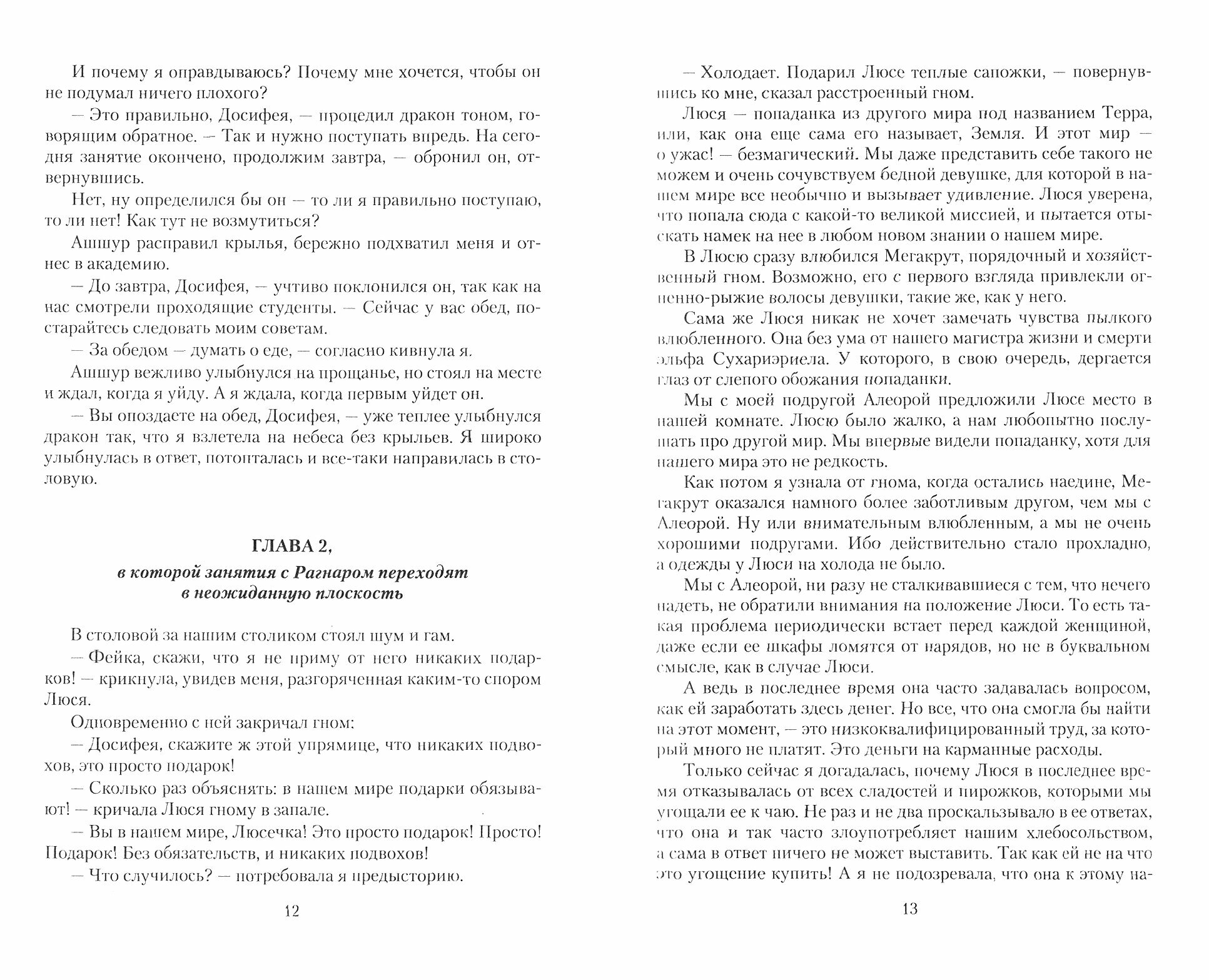 Веселые приключения ГГ-ни Феи (она же Дуся) и дракона Ашшура продолжаются. Во второй части больше внимания уделяется магической академии, но немало страниц посвящено приключениям героев, противостоянию проискам недругов, общению с богиней (а что, запросто...) и эйнжелом (ангелом), изменению мира (где наша не пропадала...) и т.п. Ну а друзья - всегда рядом. Фейка, как обычно, хулиганит, Ашшур вредничает и страдает, а жизнь продолжается... И в конце концов все образуется самым благоприятным образом. Хотя испытаний у героев много. Но раз уж стали истинной парой, надо соответствовать... Да и автор не случайно столько плюшек даровала своим непобедимым персонажам... Особенно понравилось наказание богиней строптивых драконов, забывших, что они произошли от человека, а не наоборот (интересная интерпретация легенд о драконах). И хотя книга беспредельно мэрисьюшная, но читается легко, настроение поднимает. Хотя все же больше подойдет для молодежной аудитории. А вот иллюстрации А. Клепакова к этой дилогии не понравились (хотя в целом творчество художника нравится) - девушка слишком взрослая, а выражение лица дракона - туповато-замороженное... ИМХО.