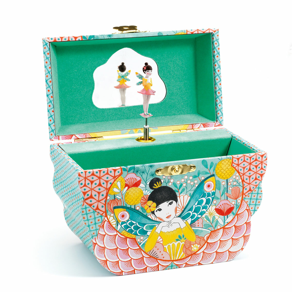 Включите механизм, откройте коробку и понаблюдайте за вращением красавицы-феи под звуки красивой мелодии «Le temps des cerises» Антуана Ренара. Также ваш ребенок сможет любоваться собой в зеркале, которое размещено на панели шкатулки.