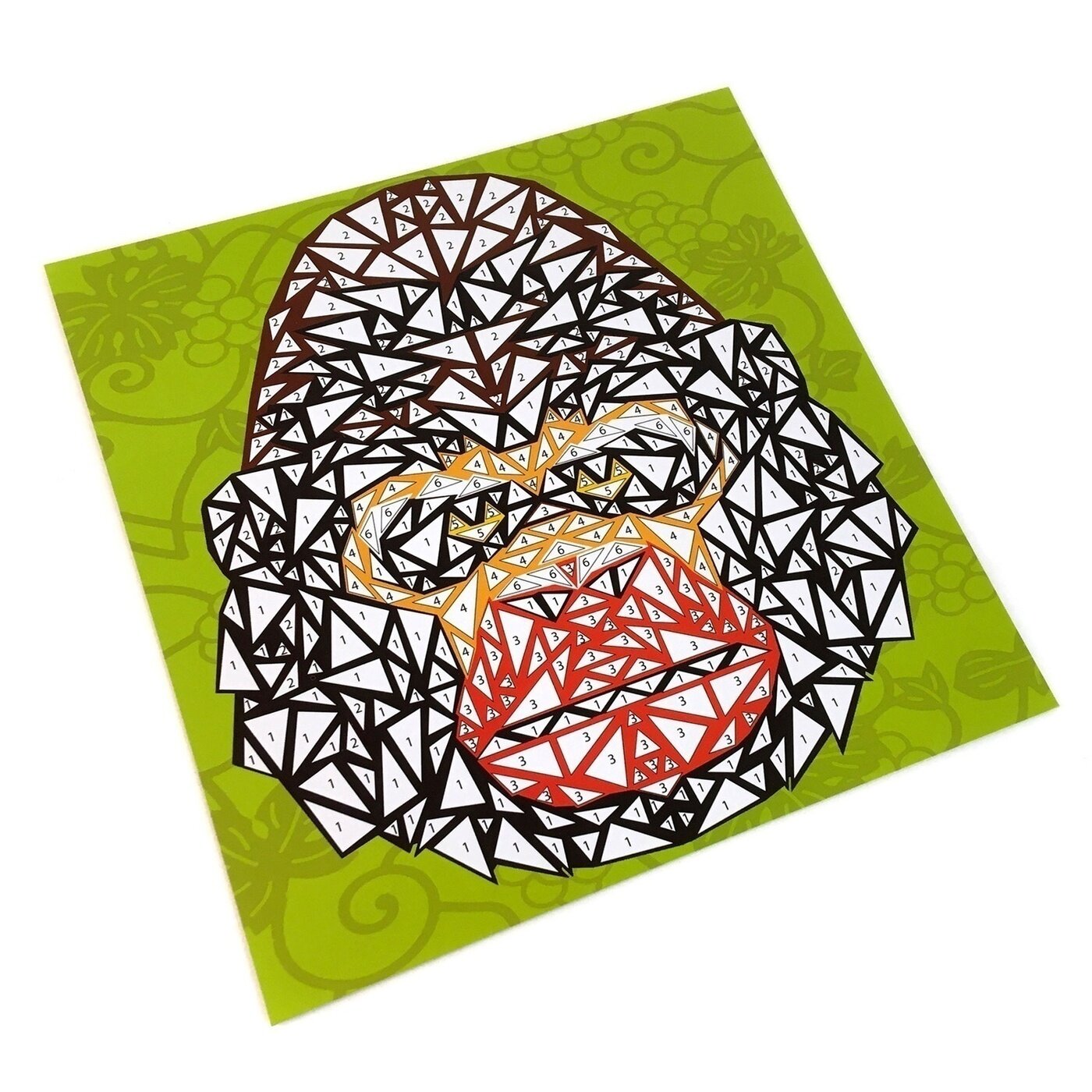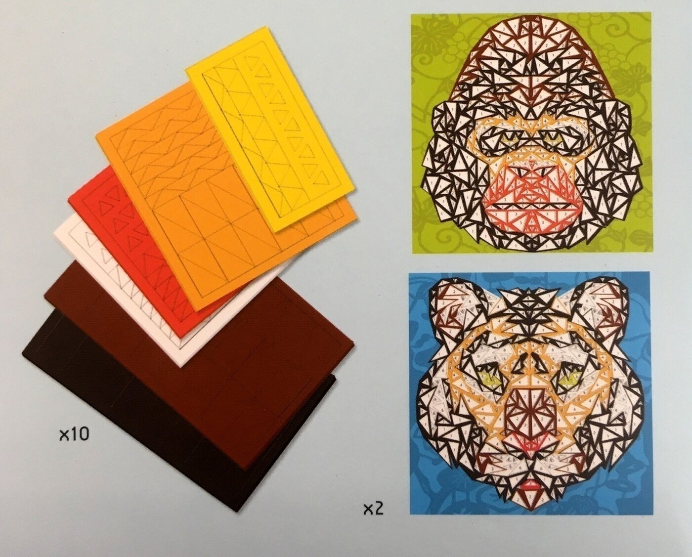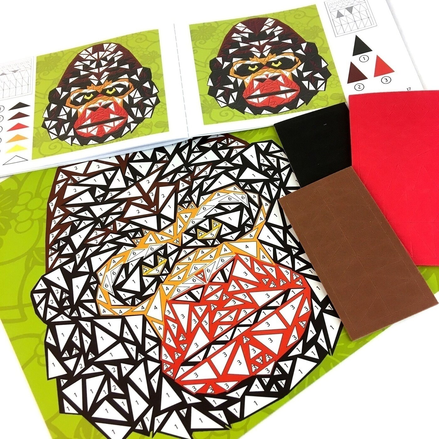 В данный набор входит: две картонные основы (21 х 21 см) с изображением гориллы и тигра; 15 листов с мягкой мозаикой на липкой основе.