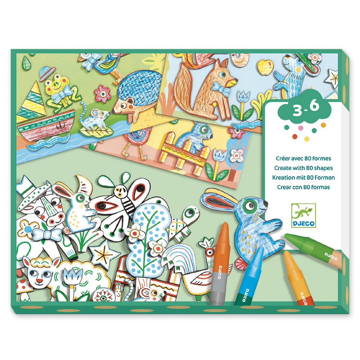 Набор для творчества «Животные» от французского производителя игрушек Djeco (Джеко) разовьет воображение, креативность и мелкую моторику. Творческий набор подойдет детям в возрасте от 3 до 6 лет. Ребёнку необходимо выдавить фигурки из листа-трафарета и разместить их на листе-основе, прикрепив их с помощью клея. Освободившиеся от фигурок трафареты также можно использовать для украшения листа-основы.