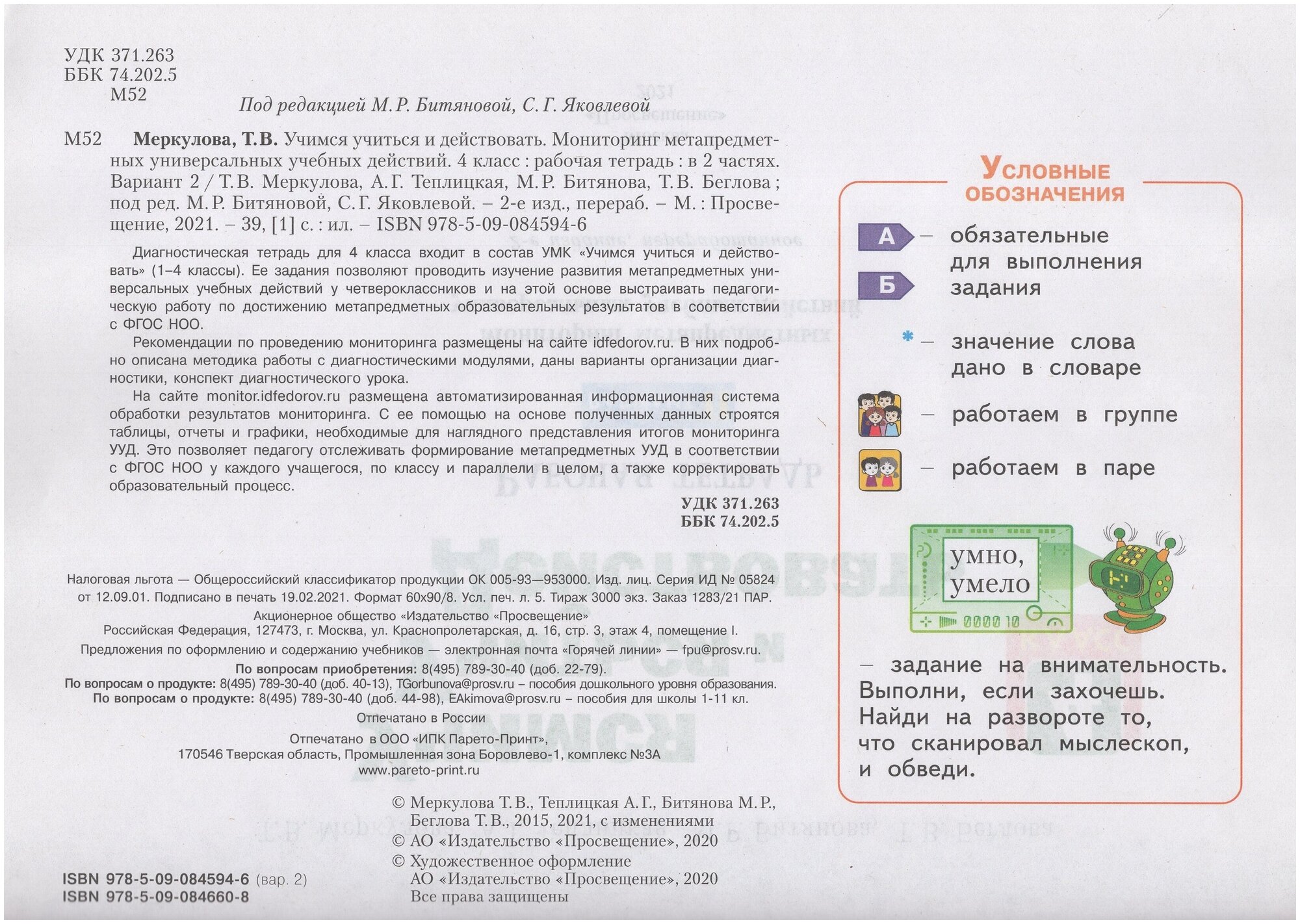 Учимся учиться и действовать 4 класс Мониторинг метапредметных универсальных учебных действий Рабочая тетрадь Вариант II (Битянова Марина Ростиславовна; Теплицкая Александра Глебовна; Меркулова Татьяна Викторовна; Беглова Татьяна Владимировна); БИНОМ. Лаборатория знаний, 2021