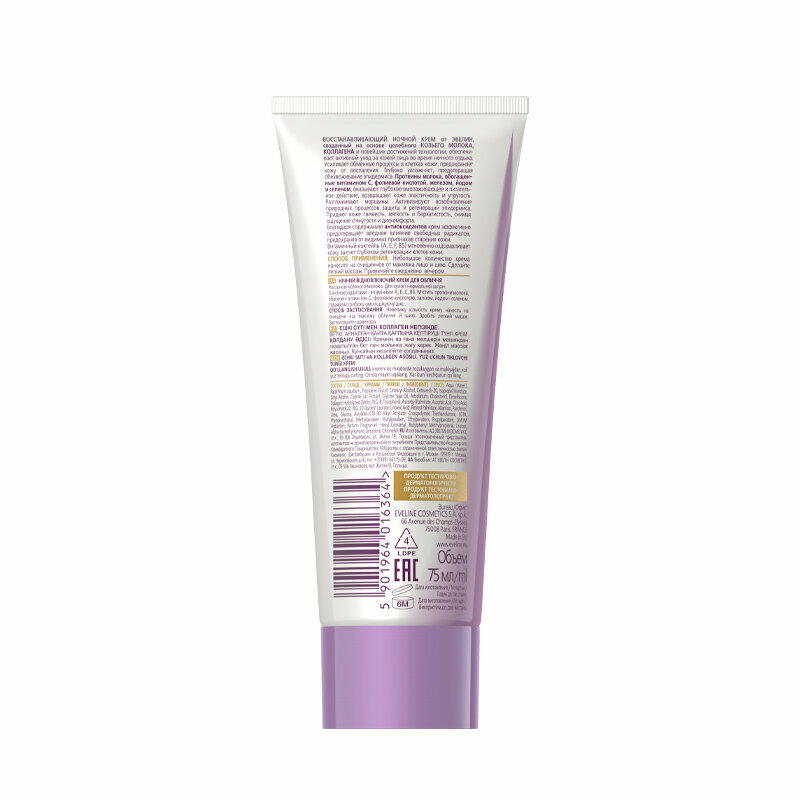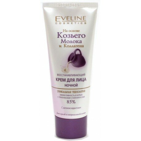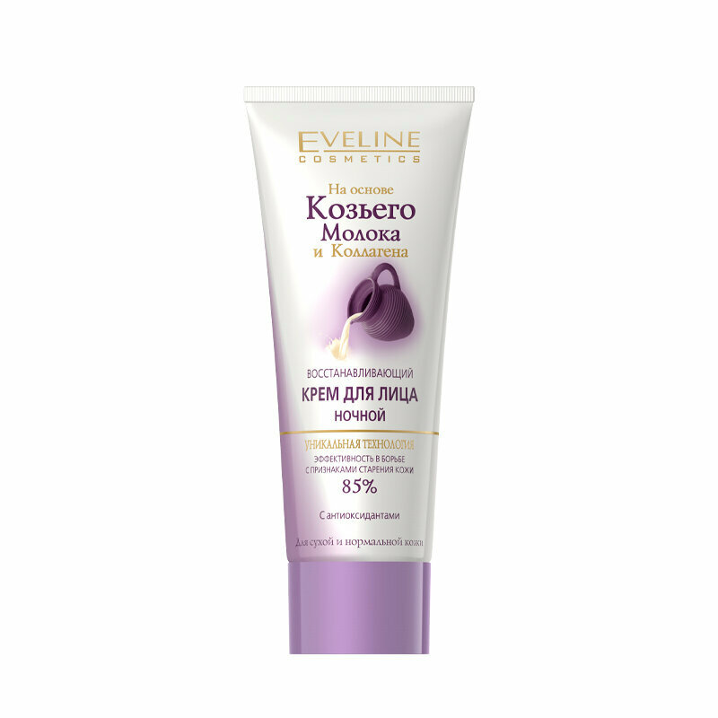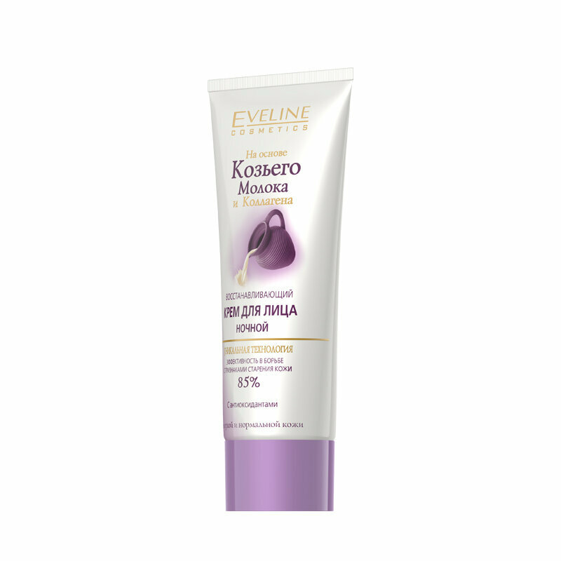 EVELINE Крем для лица восстанавливающий ночной для сухой и нормальной кожи козье молоко+коллаген, 75мл. Восстанавливающий ночной крем, созданный на основе целебного козьего молока, коллагена и новейших достижений технологии, обеспечивает активный уход за кожей лица во время ночного отдыха. Усиливает обменные процессы в клетках кожи, предохраняет кожу от воспаления. Глубоко увлажняет, предотвращая обезвоживание эпидермиса. Протеины молока, обогащенные витамином С, фолиевой кислотой, железом, йодом и селеном, оказывают глубокое омолаживающее и питательное действие, возвращают коже эластичность и упругость. Разглаживают морщины. Активизируют возобновление природных процессов защиты и регенерации эпидермиса. Придают коже свежесть, мягкость и бархатистость, снимая ощущение стянутости и дискомфорта. Благодаря содержанию антиоксидантов крем эффективно предотвращает вредное влияние свободных радикалов, предохраняя от видимых признаков старения кожи. Витаминный коктейль (A, E, F, B5) мгновенно оздоравливает кожу за счет глубокой регенерации клеток кожи.